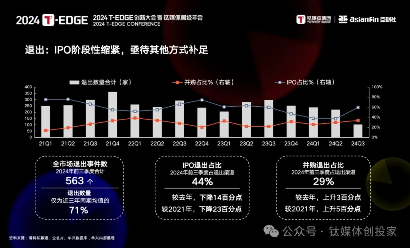 2024年前三个季度整个市场退出数量合计563起,是近三年同期均值的70%。因为全球范围内IPO路径的堵塞,导致IPO退出的占比出现明显下降。数据显示,并购的占比略有上升,但其实也不足三成。同时,大家开始频繁听到回购、清算、仲裁等以往比较罕见的退出方式案例的发生。