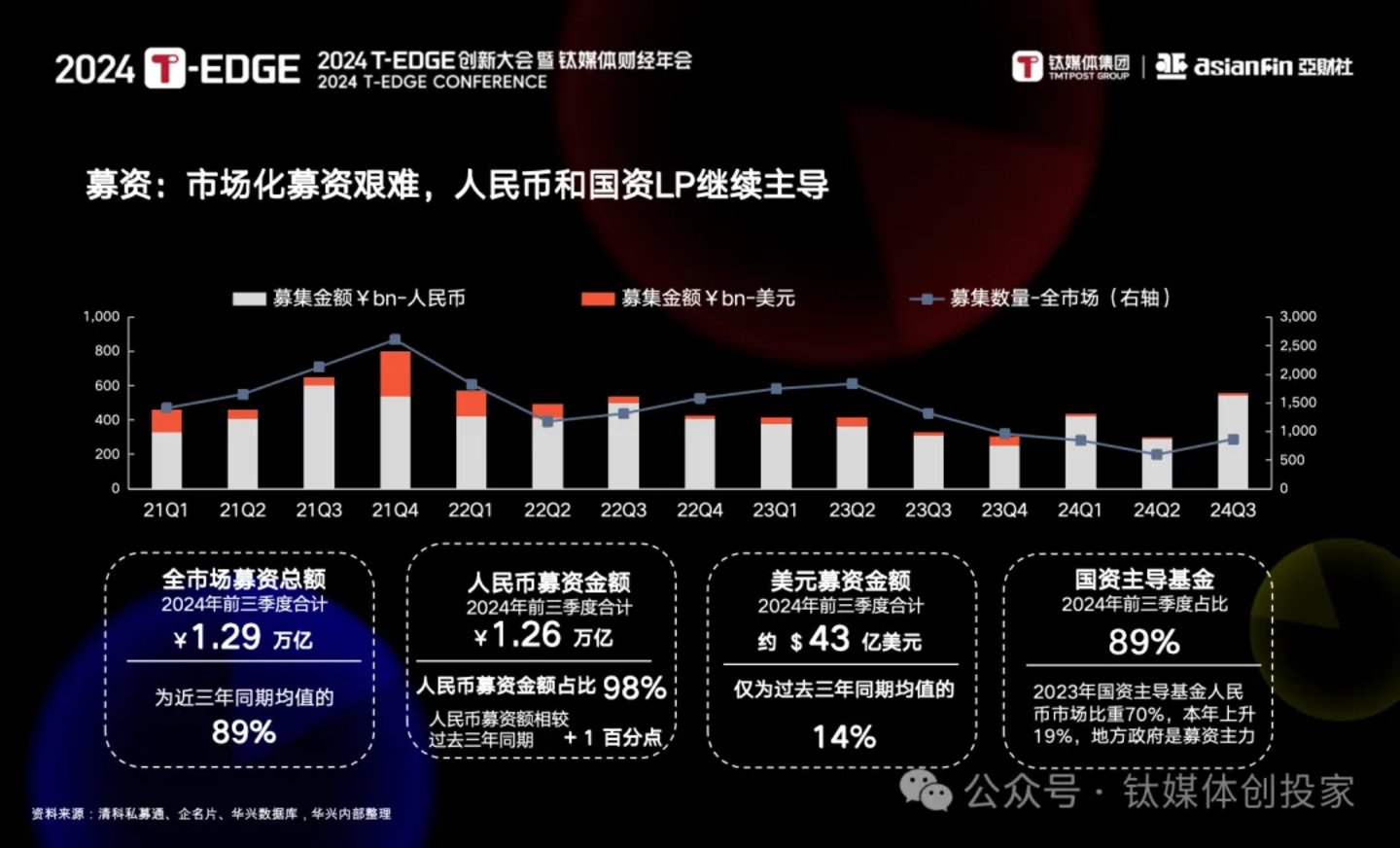 另外,人民币基金体系内的国资和地方政府引导资金已经占了绝对主力。2023年的全年数据中,国资占比为70%,今年已经上升到89%,民营和市场化的机构整体的存在感相对较弱。