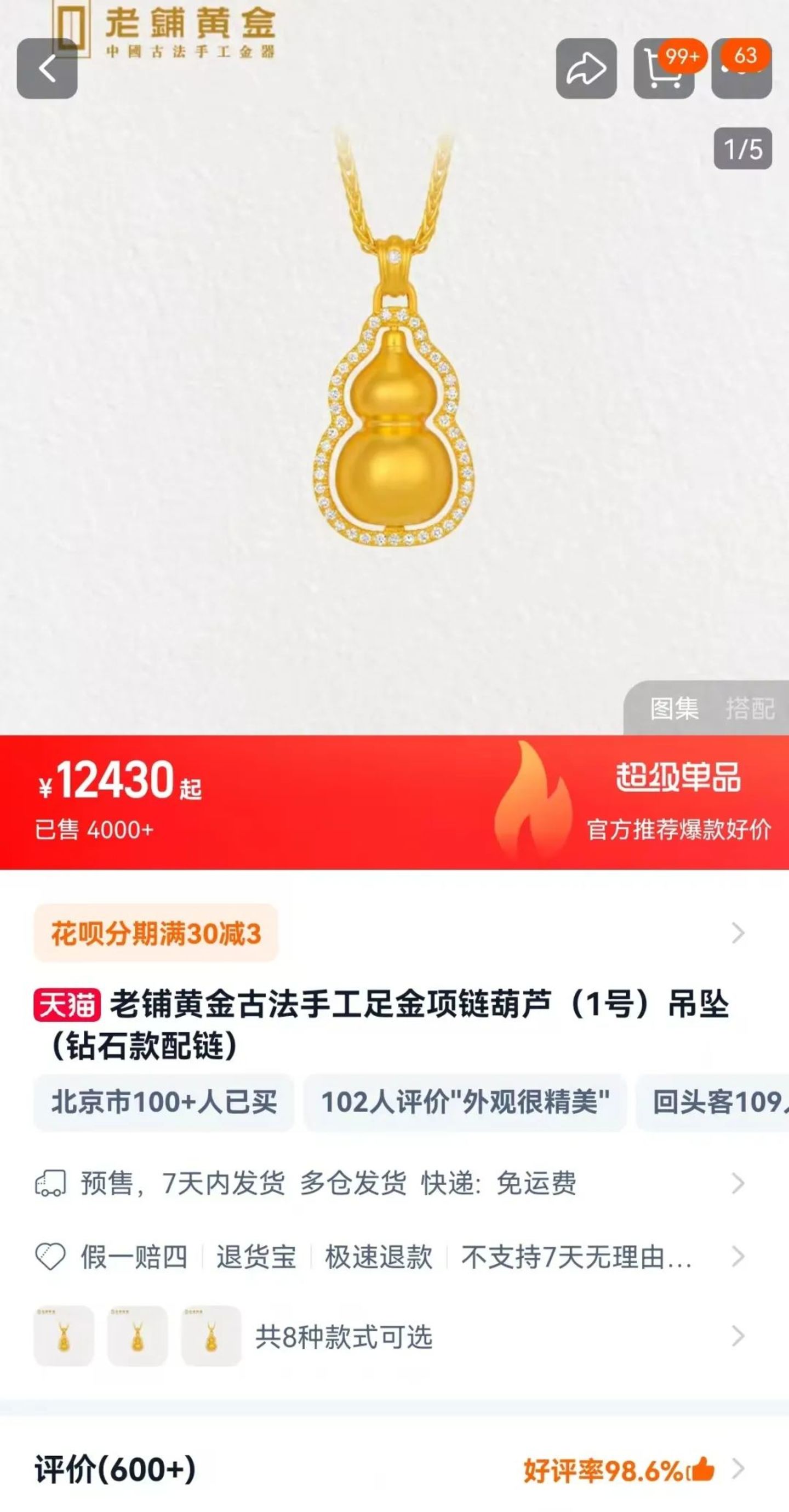 有多高端?老铺黄金不按克重计算,店里全部商品均为一口价。以爆品葫芦项链为例,8g的价格为12430元,每克价格已经超过1500元,而当天的国际金价为617元/克,周大福的金价也只有798元/克。