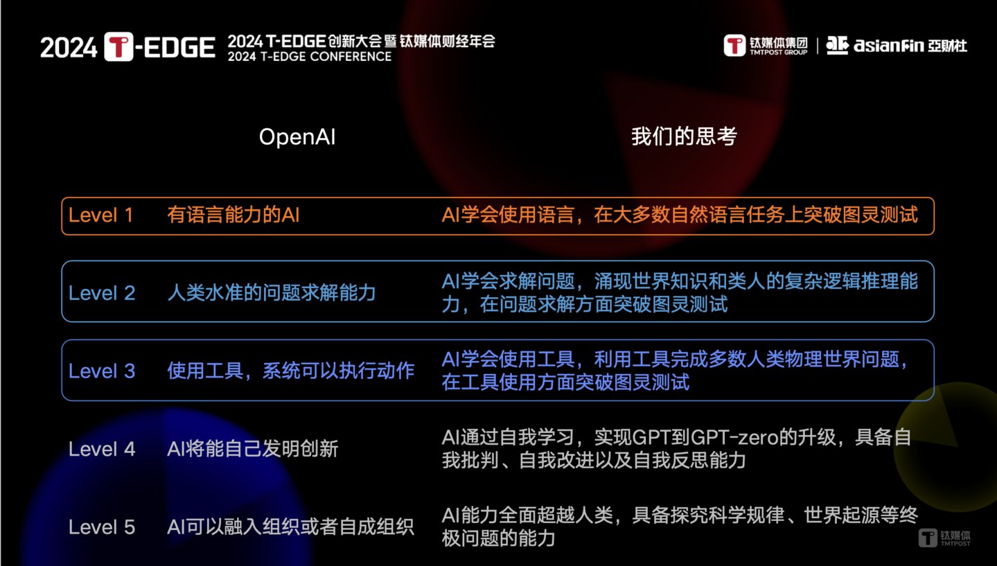 在 AGI 发展路径上,我们智谱有自己的想法。前3级和OpenAI差不多,而Level 4、Level 5两级的时候更多的想法。比如,如何实现类似像GPT-Zero,Alpha-Zero这样的升级,以及如何利用 AI 的自学习能力拓展科学边界,以及未知的世界。