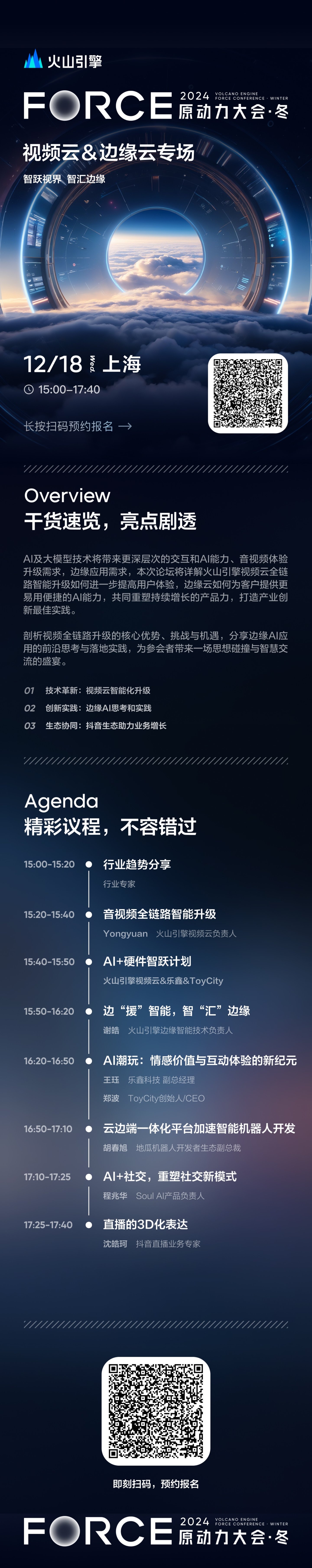12月18日,火山引擎冬季FORCE原动力大会“智跃视界 智汇边缘”视频云&边缘云专题论坛将重磅开启,直击大模型更深层的应用能力,火山引擎视频云全链路智能升级如何进一步提高用户体验,边缘AI如何为企业提供更易用便捷的AI能力、驱动产业升级……