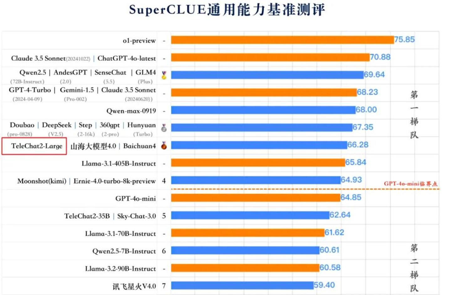 近日,权威大模型评测基准 SuperCLUE 发布最新《中文大模型基准测评2024年10月报告》中,由中国电信人工智能研究院(TeleAI)原创打造的星辰语义大模型 TeleChat2,作为央企大模型代表,综合能力位列大模型第一梯队。