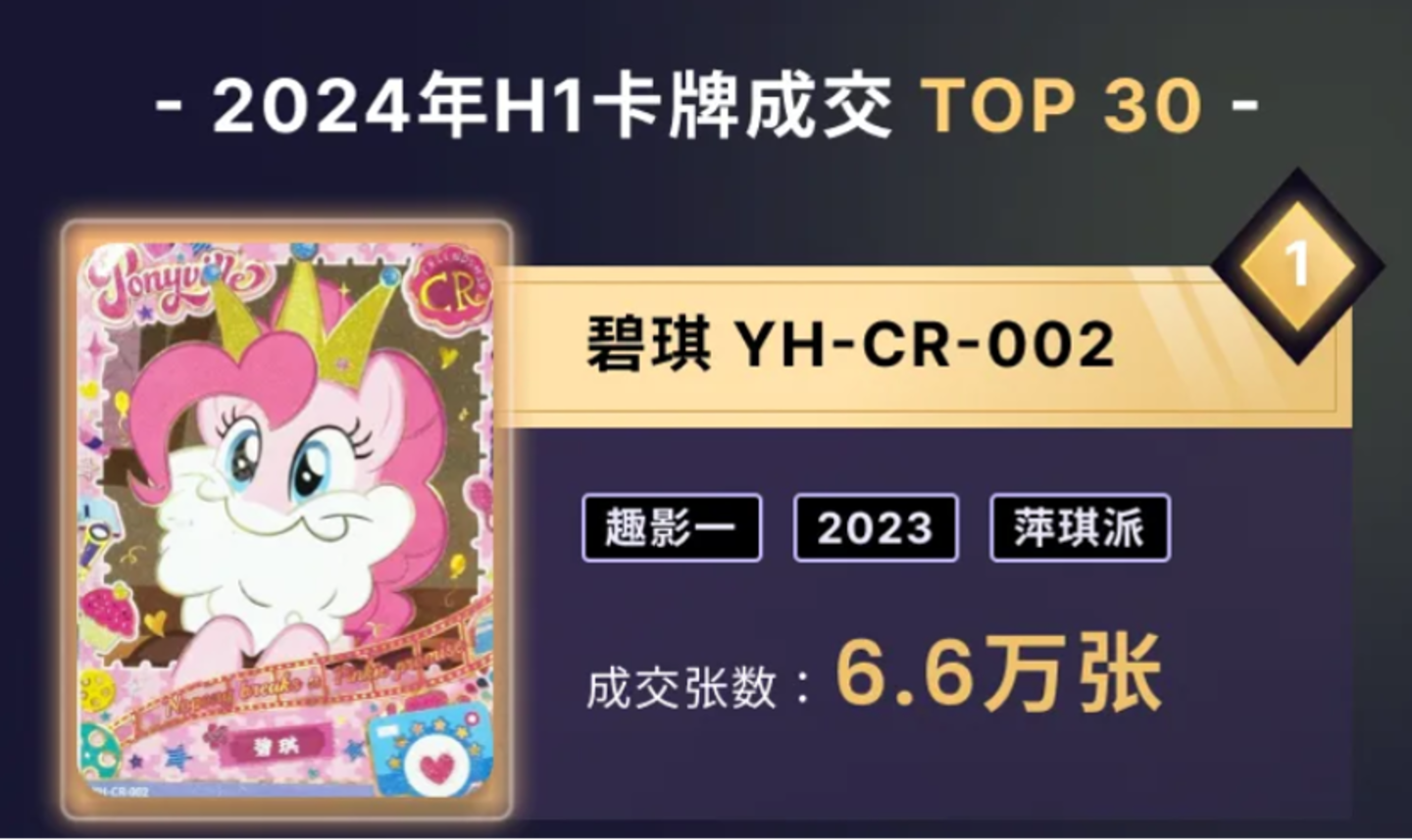 根据二手交易平台千岛官方账号公布的交易数据,截至2024年8月19日,该平台本年度最受欢迎的前5大IP是小马宝莉、叶罗丽、火影忍者、名侦探柯南、第五人格。在其2024年H1卡牌成交TOP30榜单上,前三十名均被小马宝莉全数霸榜,其中成交第一的碧琪卡牌成交张数达6.6万张。