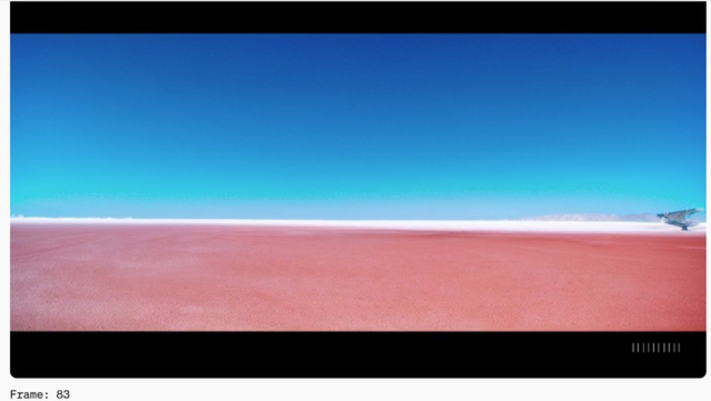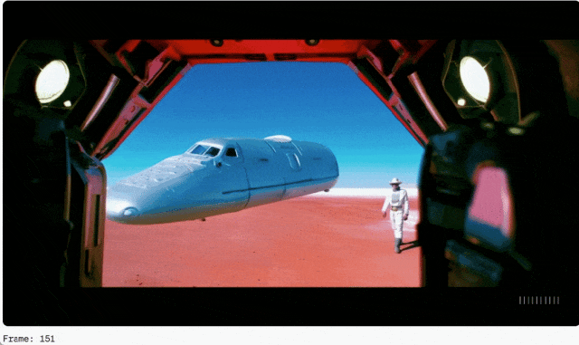 比如,让视频的前114帧生成“红色的背景下,远处停靠着一艘宇宙飞船”。