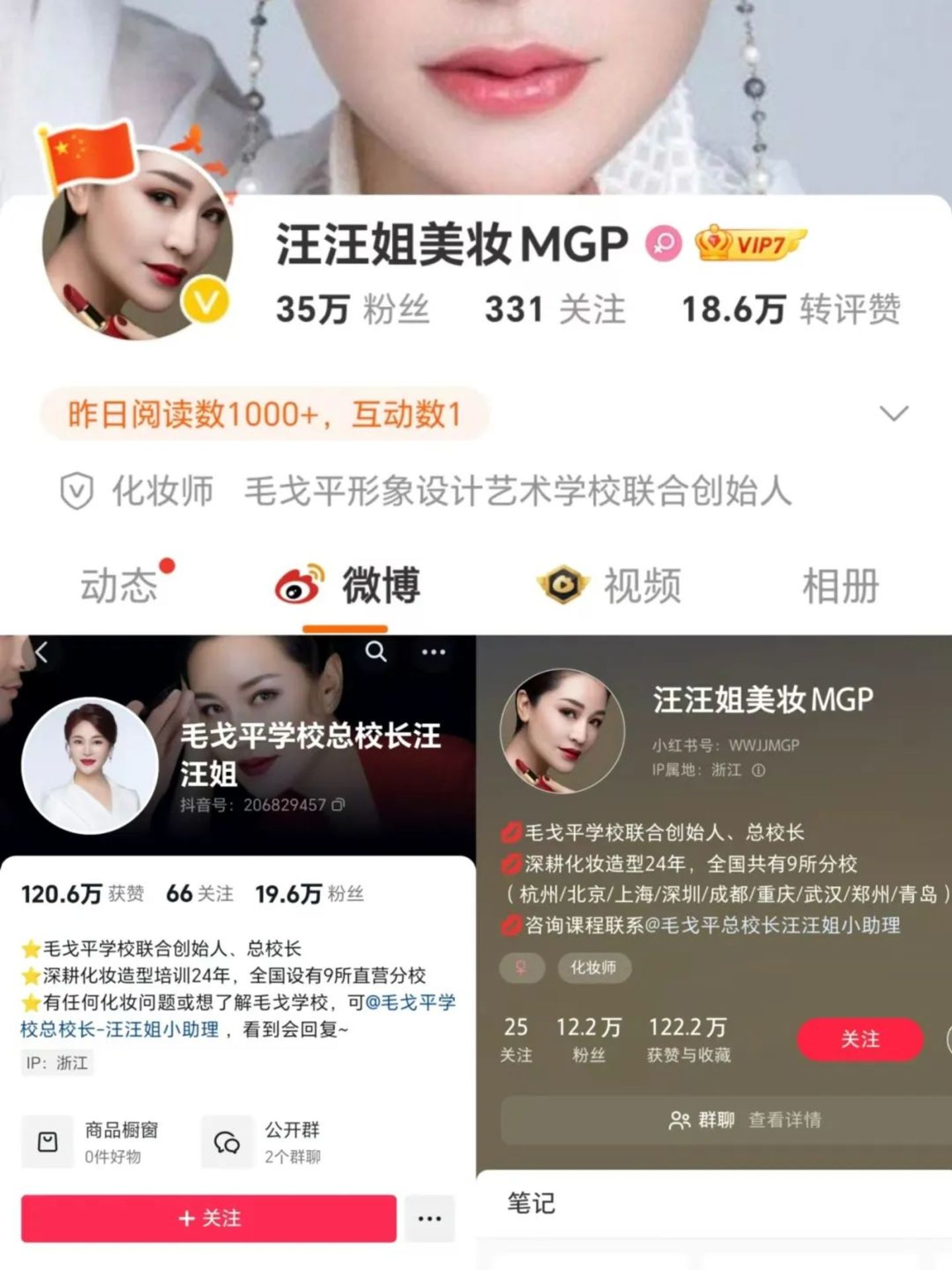 毛戈平将自身打造IP的经验复用于其线下培训体系,批量打造了一波“美妆名师IP”,毛戈平妻子汪立群是毛戈平学校最大的名师IP,名为“毛戈平学校总校长汪汪姐”,在全网有66.8万粉丝,其中在抖音有19.6万粉丝,小红书有12.2万粉丝,微博有35万粉丝。