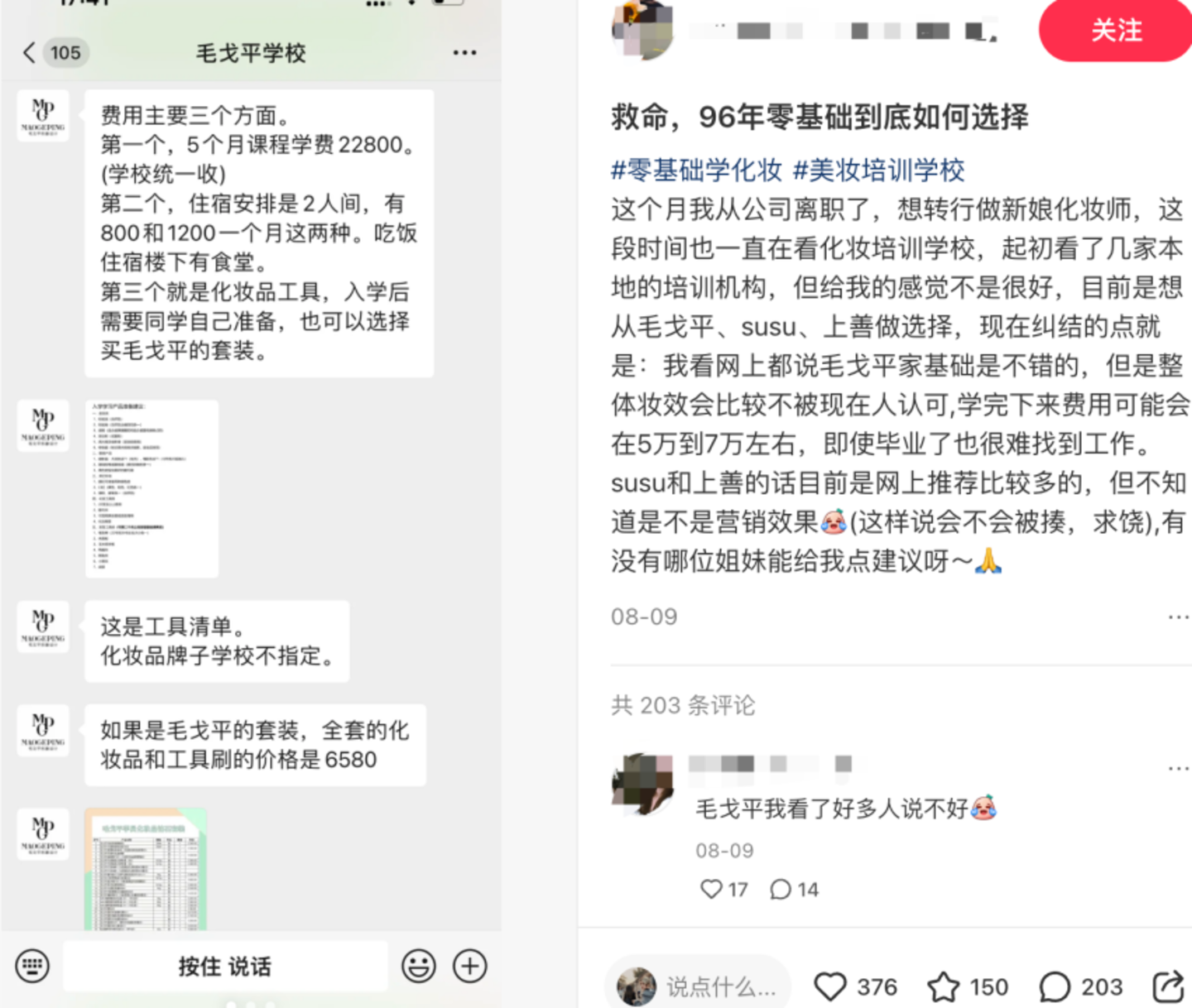 而根据另一位小红书博主晒出的笔记显示,最新5个月课程费用为2.28元,两年上涨了5000元。该博主表示,毛戈平化妆培训学一整套学下来费用大致在5万到7万之间,学费之外此外还需要自己支付每月800-1200元的房租,如若需要,可以购买毛戈平价值6580元的全套化妆品。