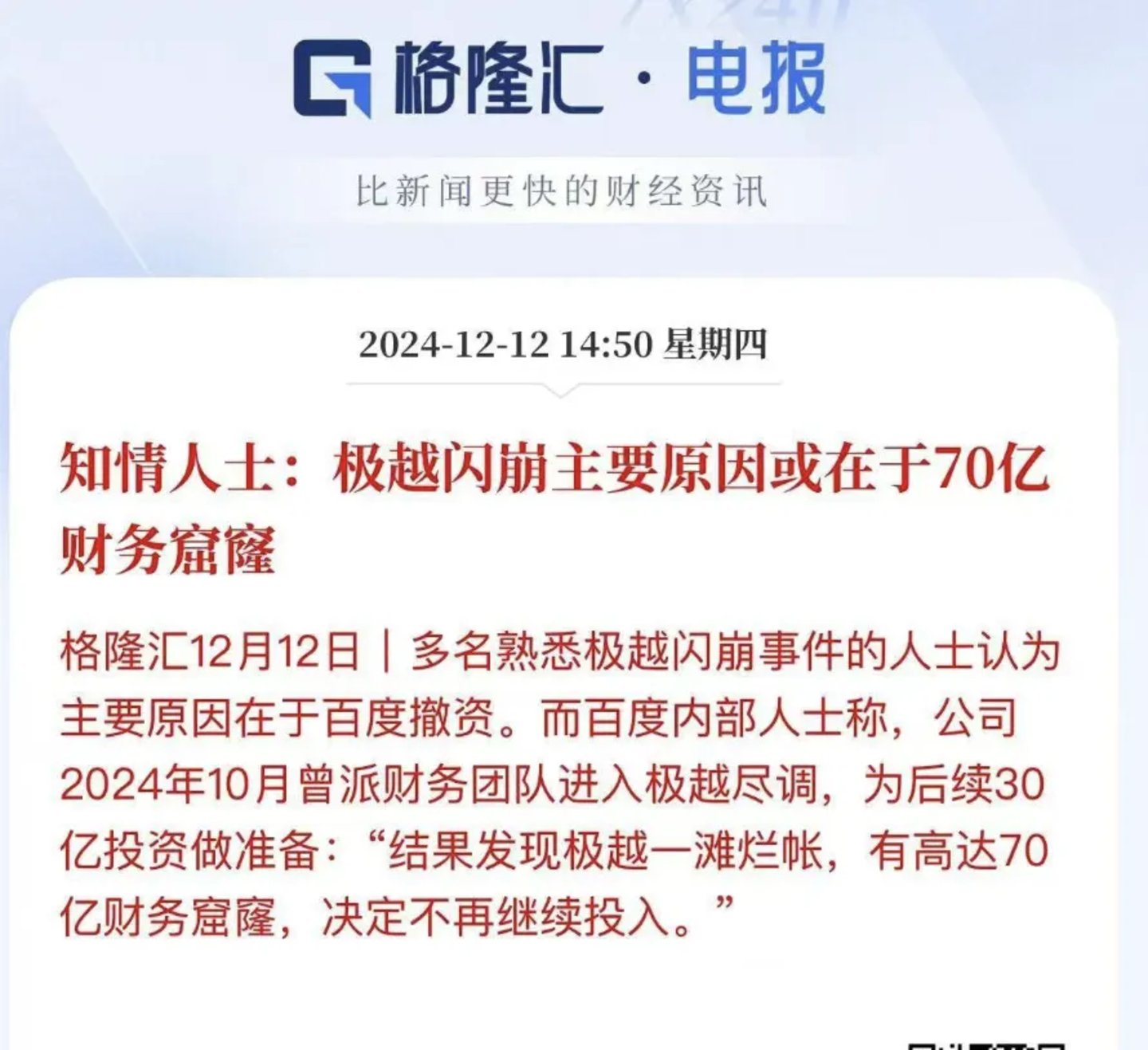 据《财新》报道,百度曾于今年10月派财务团队去极越尽调,为后续30亿投资做准备,结果发现极越面临高达70亿元的财务窟窿,遂决定不再继续投入。