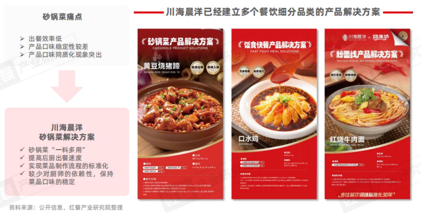 近年来,随着广大消费者的餐饮消费逐步收紧,不少餐饮品牌被迫卷入价格战,利润空间进一步压缩。以砂锅菜为例,砂锅菜目前存在出餐效率低、产品口味稳定性较差以及口味同质化现象突出的痛点。针对此,川海晨洋推出了一系列砂锅菜产品解决方案,涵盖了红烧系列、油泼系列、经典川味系列以及创新味型系列,实现砂锅菜的“一料多用”,在提高出餐效率的同时还可提升菜品标准化和口味的稳定性。