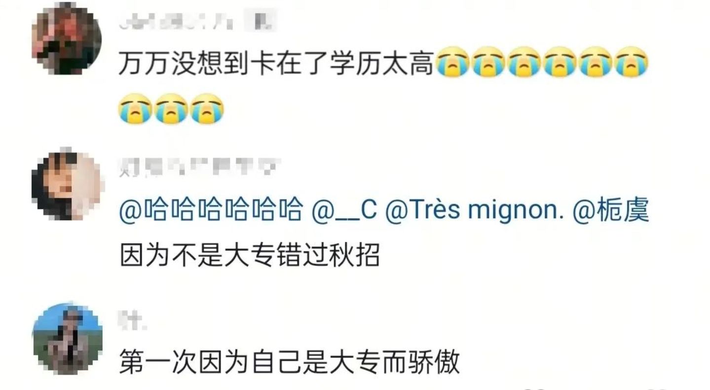 本来的要求是“不得高于大专”,结果不少985、211的硕士、研究生与张诗尧连麦,激情开摇。评论区也是效果拉满,不少网友锐评,“诗尧劝学,倒反天罡。”
