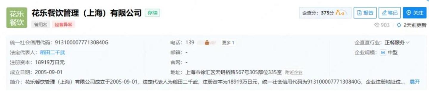 根据公开资料,2006年,由日本稻田公司(发明了全球首台家用按摩椅的公司)董事长稻田二千武创立的花楽在上海正式开门营业,该店是当时名噪一时的天妇罗品牌,但由于经营不善于2017年左右闭店。企查查显示,花乐餐饮管理(上海)有限公司创立于2005年,股东之一为稻田二千武,已被上海市市场监督管理局列入经营异常名录。