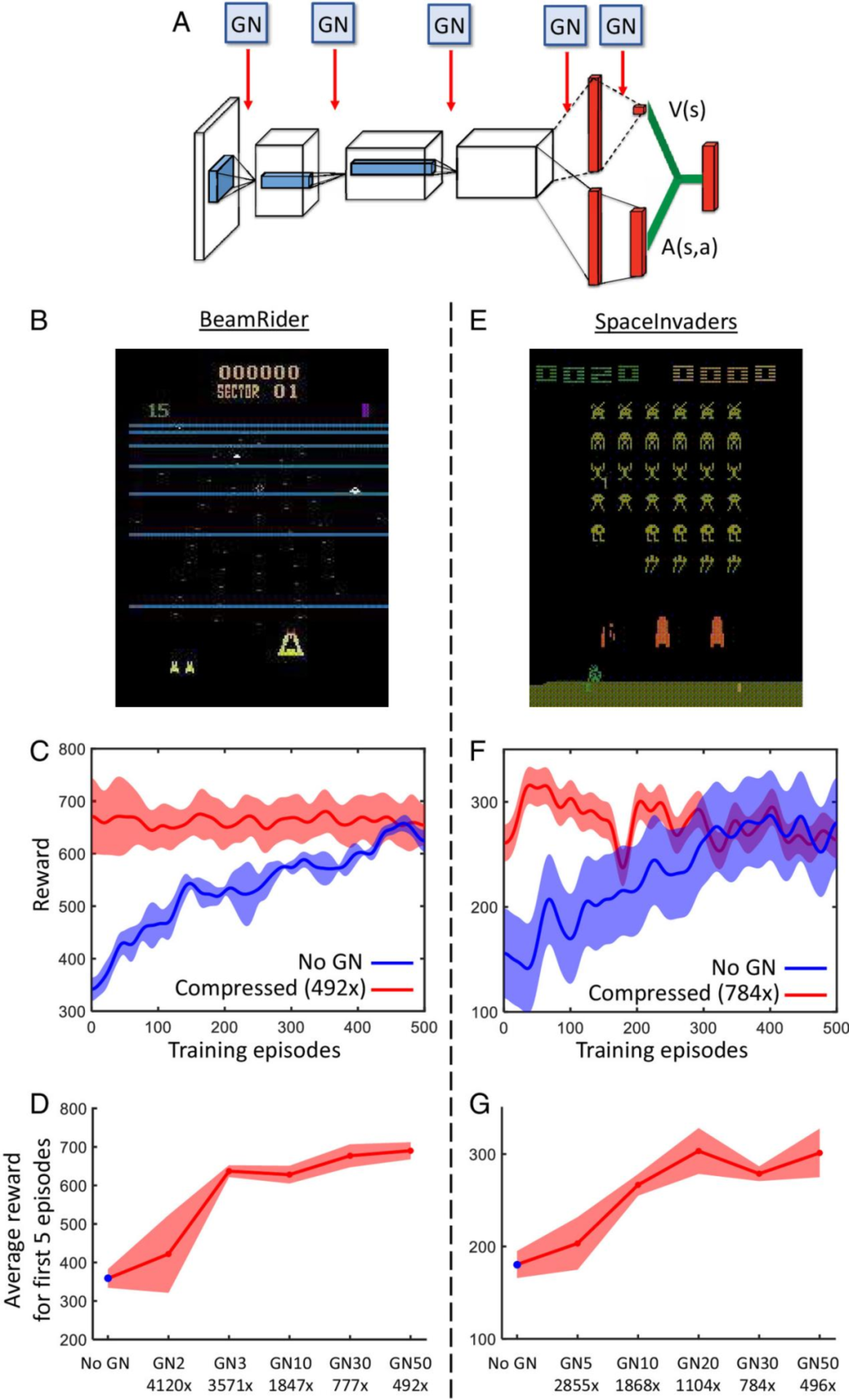 ▷图4. 基于基因组瓶颈原则设计的人工神经网络在强化学习任务中的架构及表现. 图源:Shuvaev, S., Lachi, D., Koulakov, A., & Zador, A. (2024). Encoding innate ability through a genomic bottleneck. Proceedings of the National Academy of Sciences, 121(38), Article e2409160121.