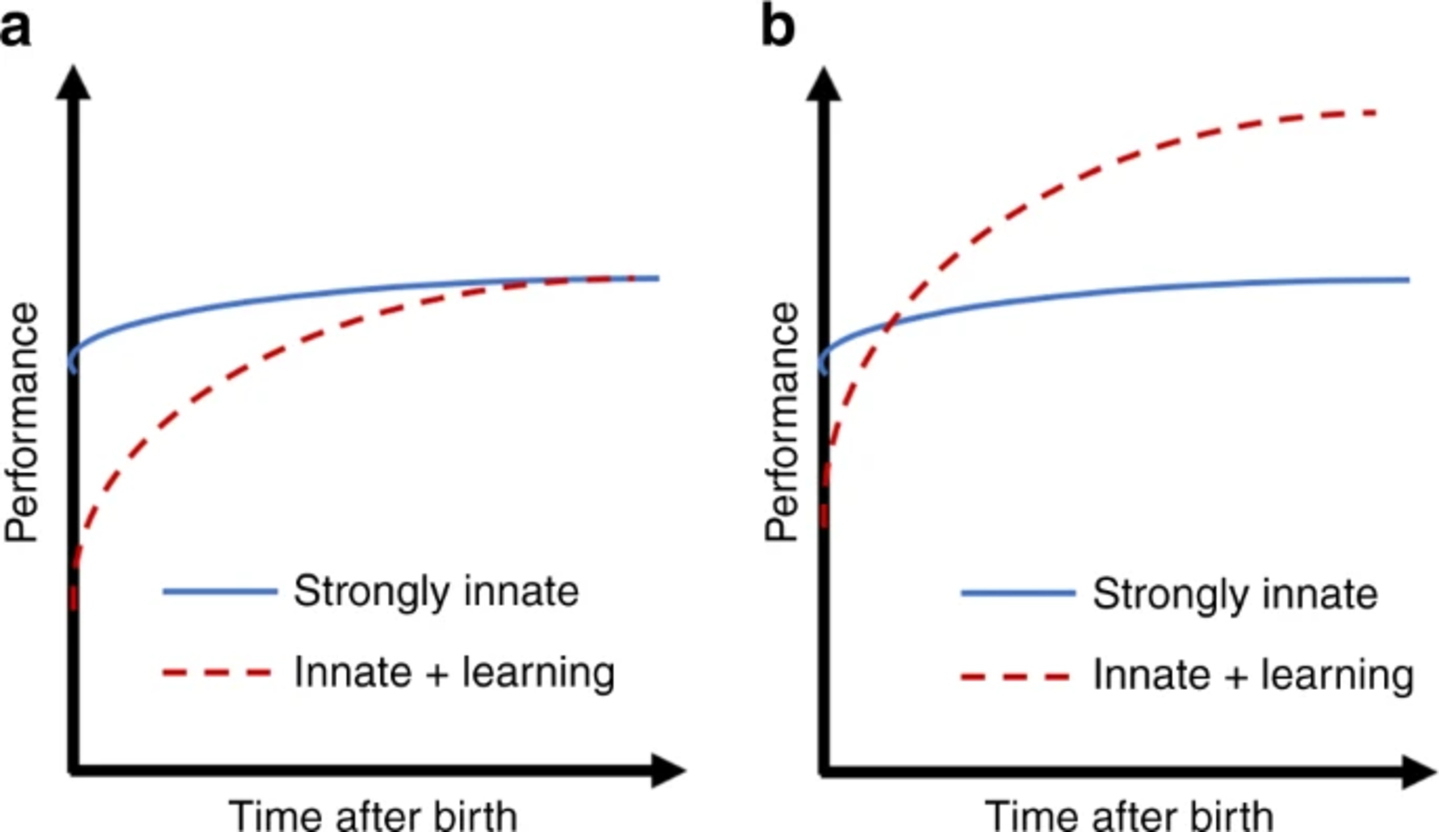 ▷图3. 使用先天加后天学习策略的物种,如果其表现优于单纯依赖先天本能的物种,则会具有进化优势. 来源:Zador, A. M. (2019). A critique of pure learning and what artificial neural networks can learn from animal brains. Nature Communications, 10, Article 3770.