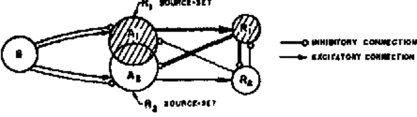 ▷图2. 感知机,描述了包含兴奋性与抑制性两类不同的神经元 来源:Rosenblatt, F. (1958). The perceptron: A probabilistic model for information storage and organization in the brain. Psychological Review, 65(6), 386-408.