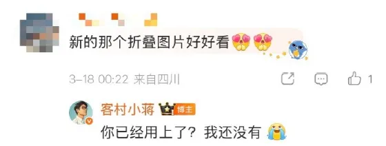 而对于此次折叠发图功能,客村小蒋在微博上与网友互动时称:“你已经用上了?我还没有。”