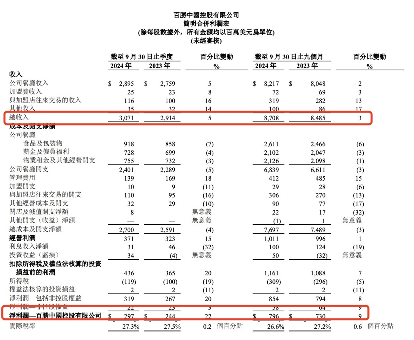 今年前三个季度,百胜中国营收同比增长2.6%至87.08亿美元,净利润同比增长9%至7.96亿美元。三季度,百胜中国营收同比增长5.4%至30.71亿美元,净利润同比增长21.7%至2.97亿美元。