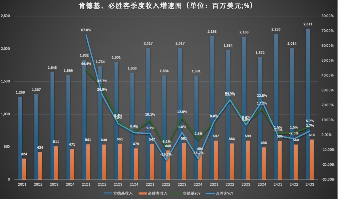 根据此前百胜中国披露的财报数据显示,今年三季度,百胜中国营收30.71亿美元,其中肯德基收入23.11亿美元,总收入占比75.3%;必胜客收入6.15亿美元,总收入占比20%、