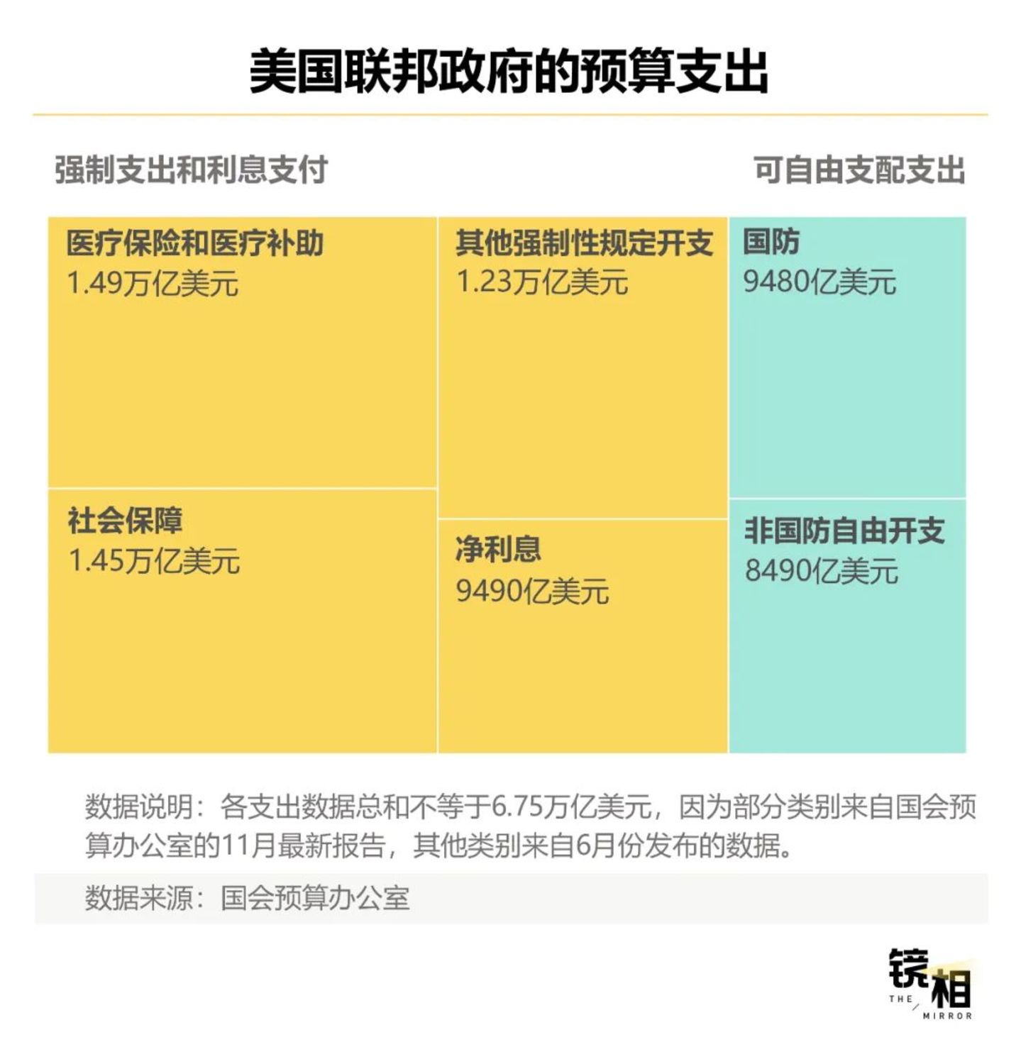 根据国会预算办公室的数据,美国政府四成的预算用在了强制支出上的医疗保险、医疗补助,以及为退休人员提供社会保障福利。