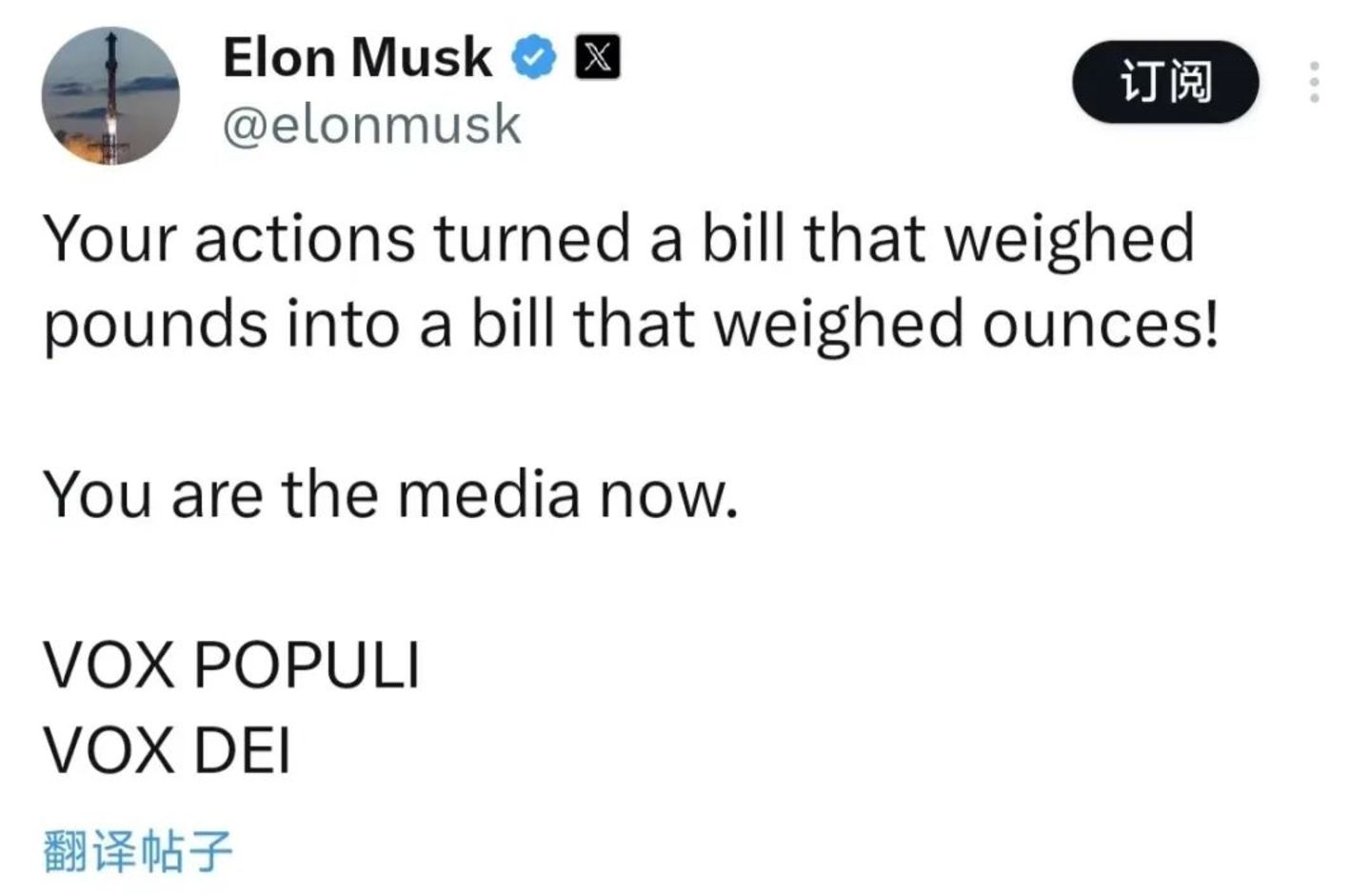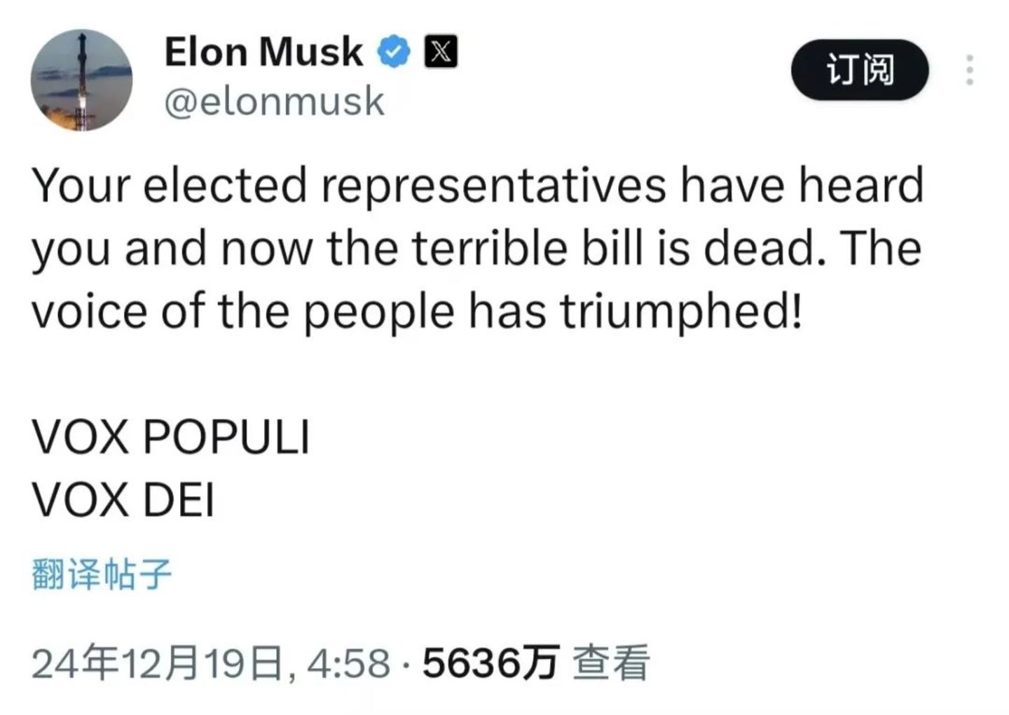 在避免美国政府关门的第一份法案失败以及第三份法案通过后,马斯克发布了两篇帖子,都以拉丁语“Vox Populi, Vox Dei”结尾,意思是“人民的声音就是上帝的声音”。