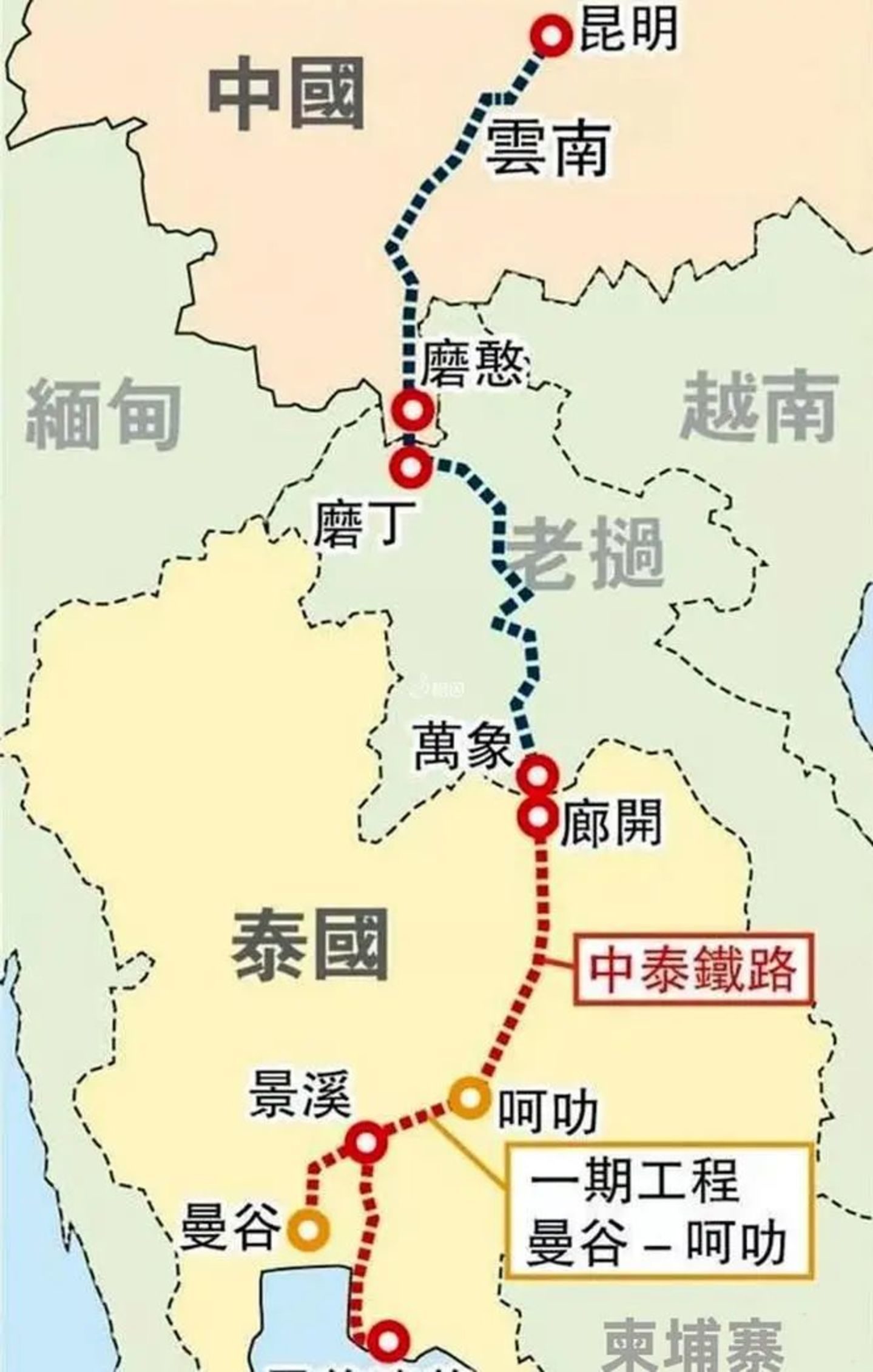中泰铁路一期工程将把泰国首都曼谷与呵叻连接起来,预计2028年开通,从昆明出发的高铁能以250km/h的速度直达泰国曼谷。待二期工程完工后,一条贯通泰国、老挝和中国西南,直到泰国湾的铁路大动脉即可宣告正式成型。