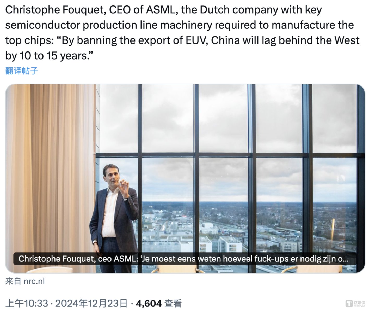 “我们正在为世界做一些重要的事情,我们拥有令人难以置信的市场地位。我们每天都为此竭尽全力。但你也为此付出了代价:关注和外部压力。这一点将继续存在,中国、美国以及每个政府都将 ASML 视为拼图中的关键部分。”富凯表示。