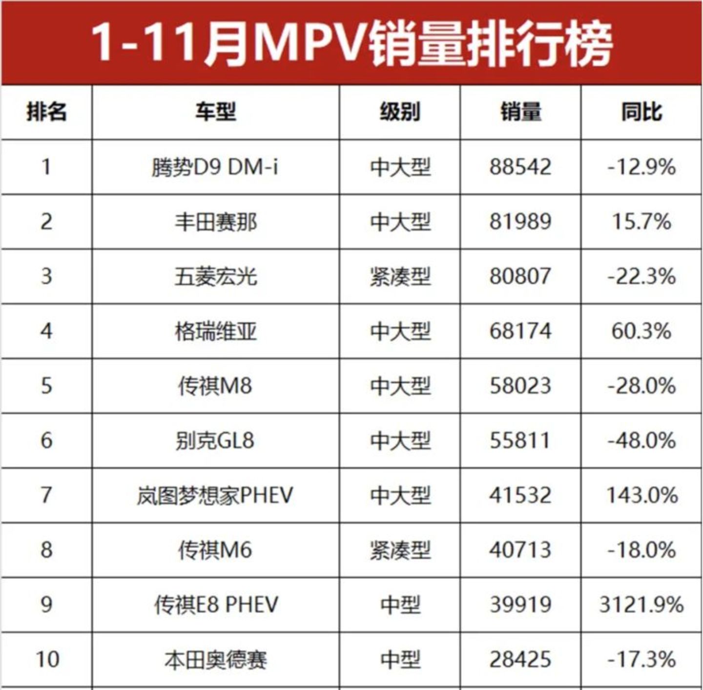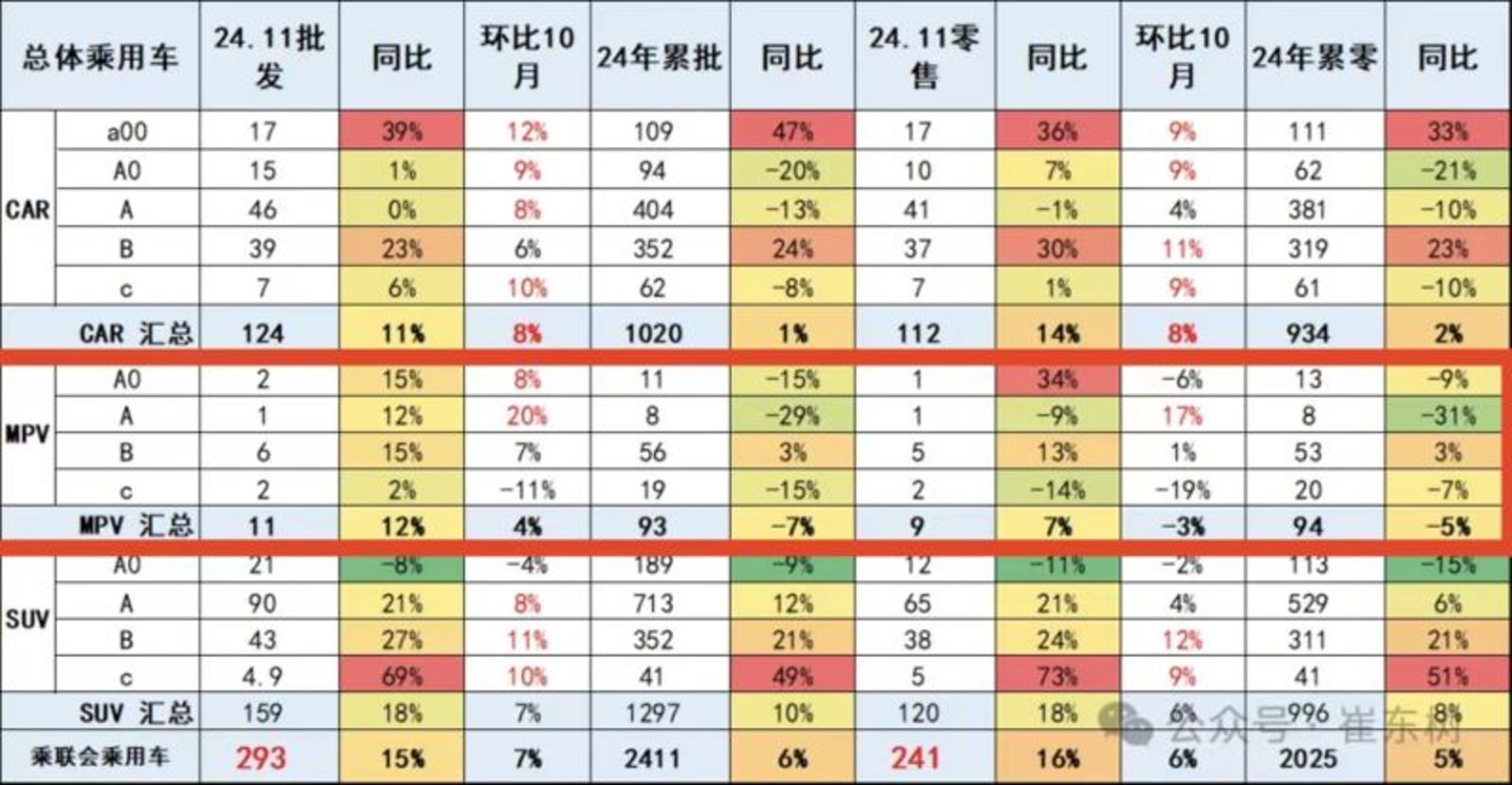 据乘联会秘书长崔东树公布的数据,2024年1-11月,国内MPV累计零售销量94万辆,同比下滑5%。三胎家庭也不愿为MPV买单了。