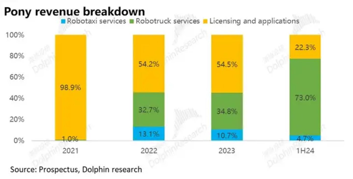 1)小马智行,它的收入不是来自于网约车,反而主要是向to B客户提供自动驾驶卡车运输服务(场景降维)以及技术降维(从L4降到L2,为OEM提供量产解决方案)来获得自身造血。