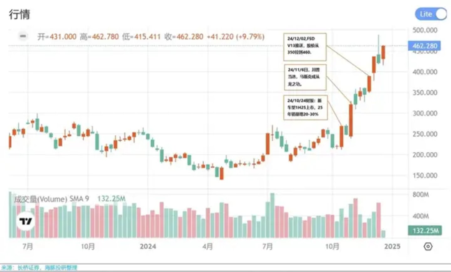 而真正让特斯拉股价插上想象力的翅膀,脱线狂飞的是“川普当选+V13推送”的双点共振,直接把特斯拉股价拉到了1.5万亿美金、单股超450美元的高空当中。
