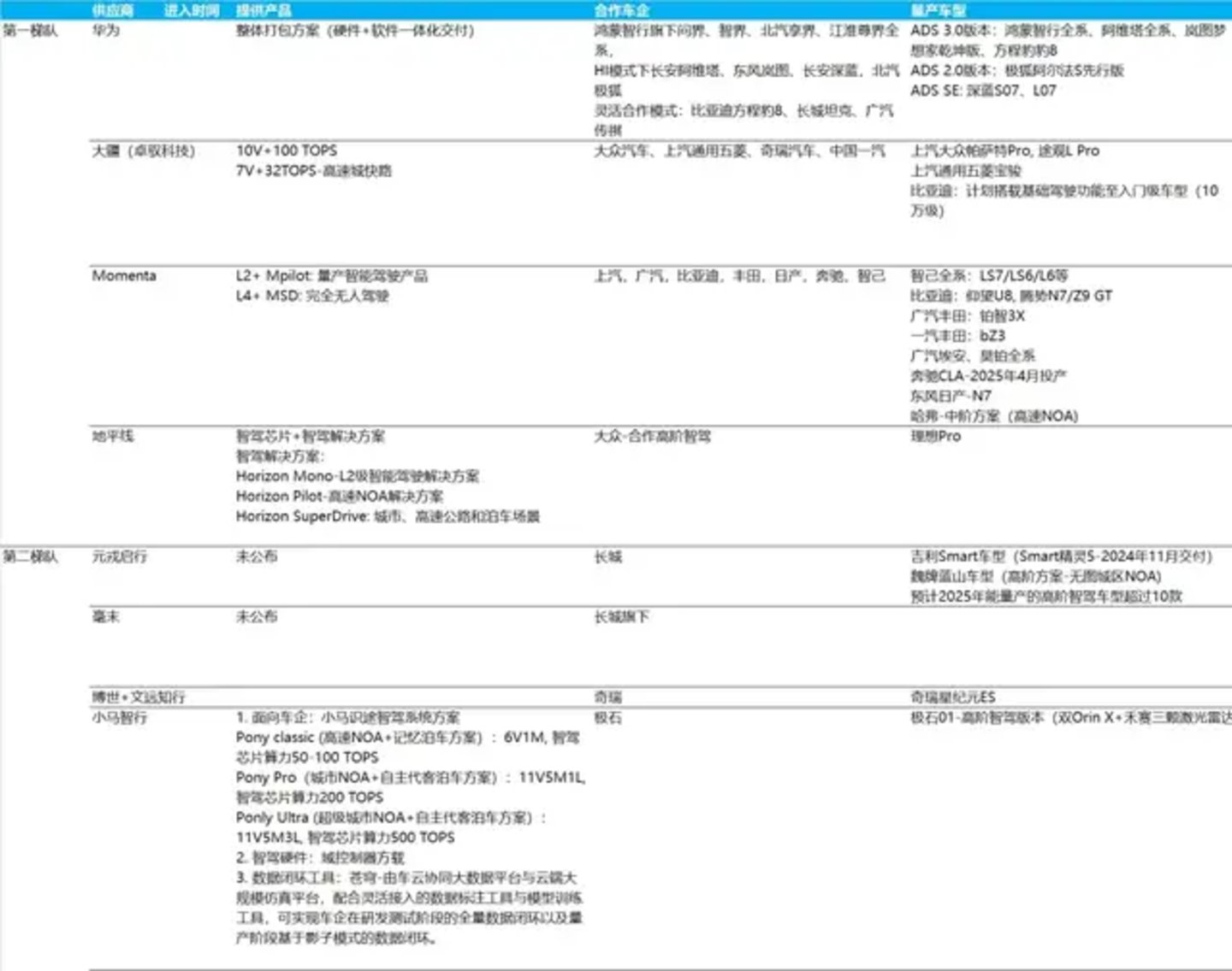 从目前的竞争格局来看,L2+走极致性价比路线的大疆和地平线,以及走在高阶智驾技术前列的华为和Momenta,已经凭借自身的技术实力和量产经验,组成了智驾供应商的第一梯队,市场格局越往集中化方向发展, 留给其余L4厂商的弯道超车的可能性空间并不大。