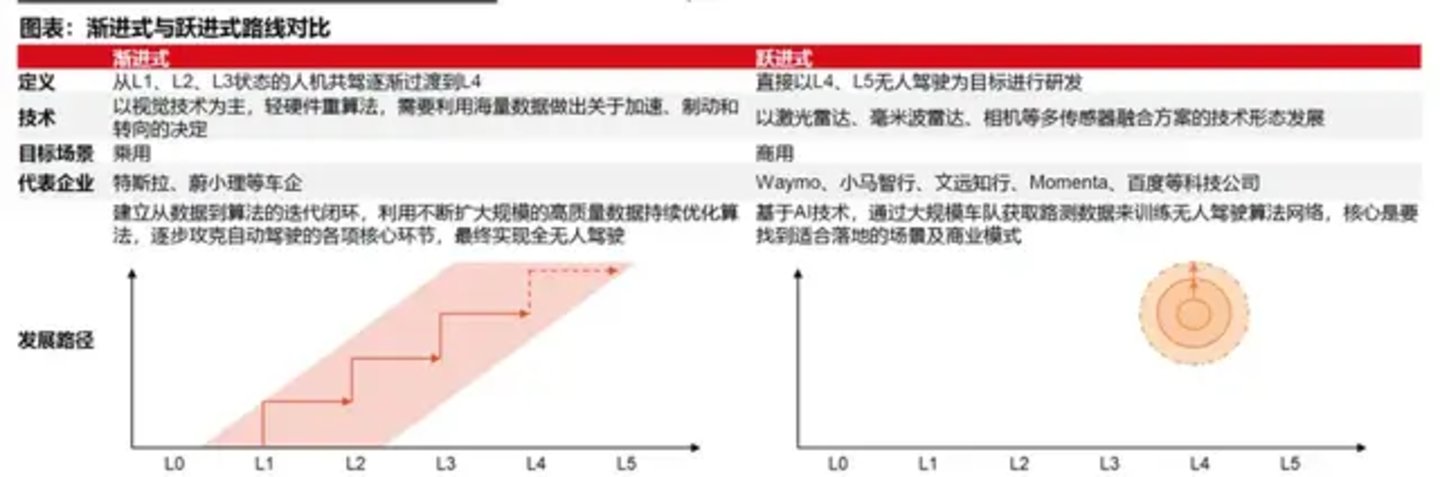 国内走特斯拉这种L2逐步晋级到L4的玩家如主机厂如小鹏、理想、蔚来、华为、小米等,大干猛加激光雷达直接走L4、L5的,国内主要是以百度、小马智行、文远知行等,这些服务商下级去做L2时候,普遍会发现完全不是一个技术路径,很难把L2做好。此外Momenta是双路线并行,L2做得还算不错,是因为它L2起步很早,已经积累了一定的量产经验,切换端到端路径会更快。