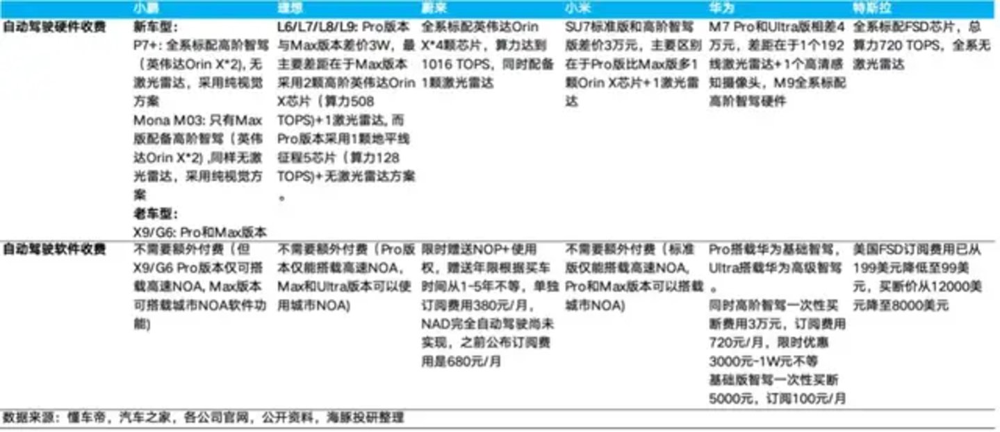 对于这两类玩家的商业变现,海豚君先来总结一下主机车为主的渐进阵营,简单来说,国内市场,主机车们面向to C端的消费者时候,FSD普遍没有独立收费能力,基本都是打包在整车销售中。