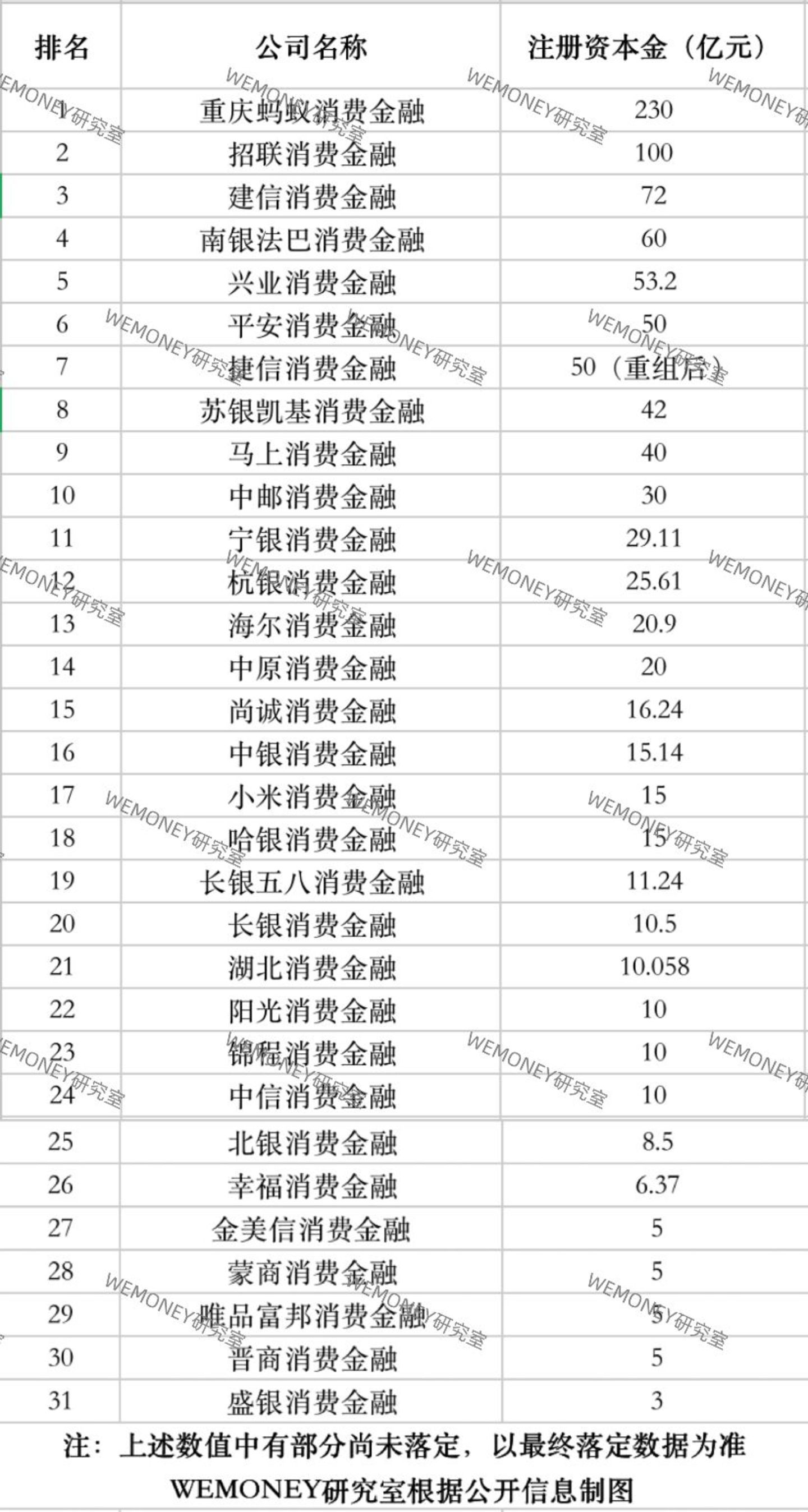 随着新一轮增资布局,消费金融公司注册资本排名重新洗牌。经WEMONEY研究室统计,截至2024年末,注册资本金排名前十的消费金融公司分别为:蚂蚁消费金融230亿,招联消费金融100亿,建信消费金融72亿,南银法巴消费金融60亿,兴业消费金融53.2亿元,平安消费金融50亿元,(重组后)捷信消费金融50亿元,苏银凯基消费金融42亿元,马上消费金融40亿元,中邮消费金融30亿元。