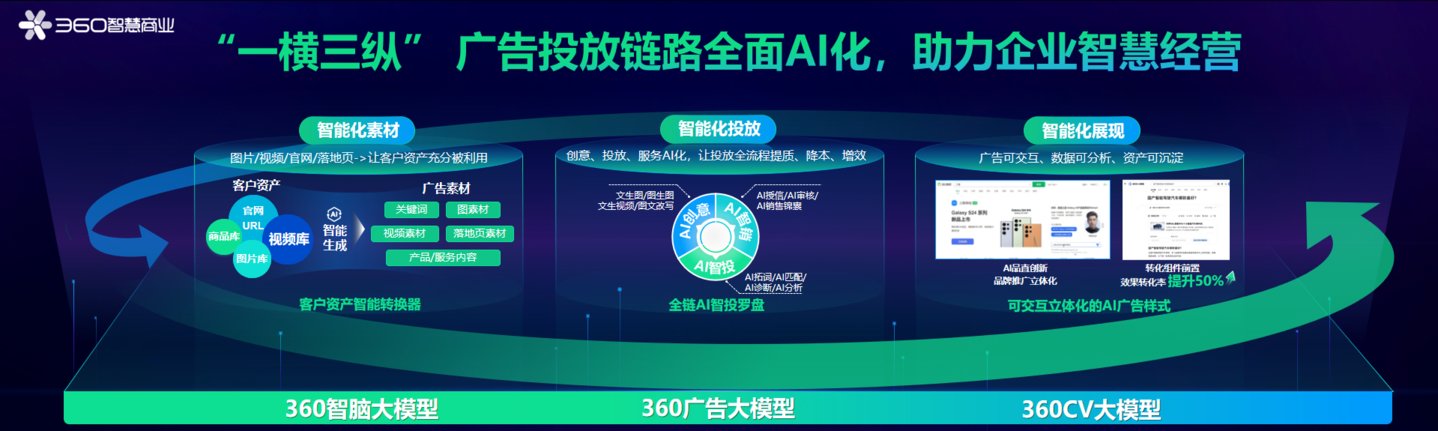 基于360智脑大模型、360广告大模型、360CV大模型等底层大模型能力构建了“一横三纵”广告投放链路,以智能化素材、智能化投放、智能化展现,助力企业营销提质。