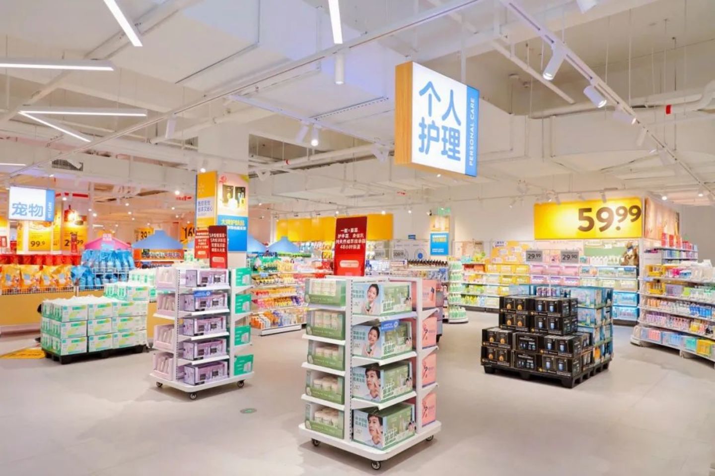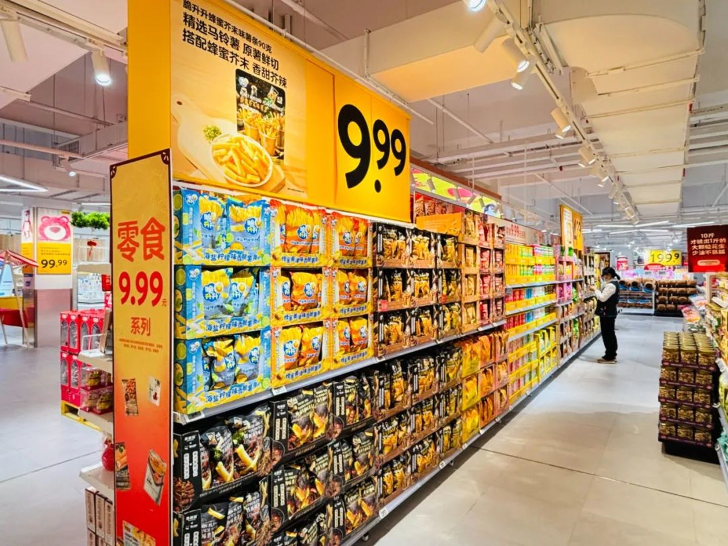 如果视线穿过堆叠的「熊山」,顾客会看到更低的货架、更多的开放式陈列、更醒目的黄色特价牌;与此同时,主通道陈列被取消,商品全貌一眼尽揽。在视觉上,整个卖场看起来明亮通透,更为精致。