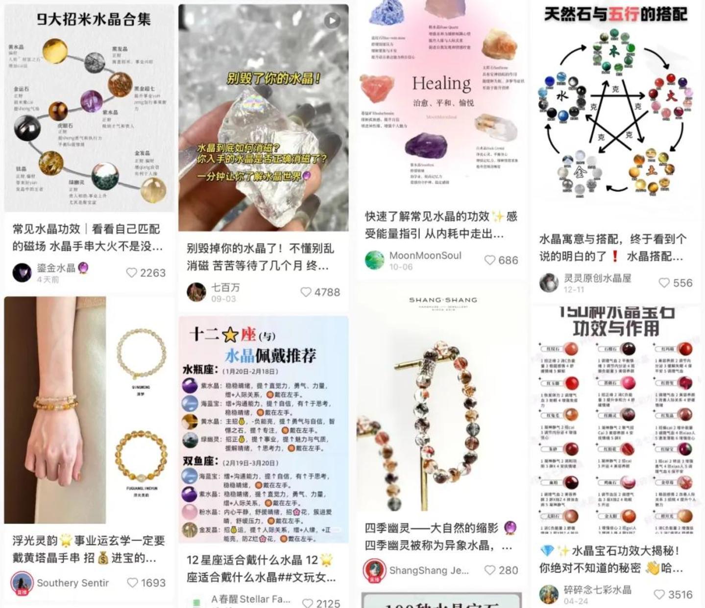 在小红书上,“#水晶”和“#水晶手串”两个话题分别有22.3亿和9.5亿的浏览量,仅和“水晶功效大全”相关的内容,就有超5000篇笔记。在这些笔记里,水晶被认为是能带来好运、调节情绪和能量的东西,比如黄色系水晶能调动人的积极性,绿色系水晶能改善人际关系、排除负能量,蓝色系水晶象征睿智、理性和思考能力,紫色系水晶则可以强化心灵力量、开悟通灵。