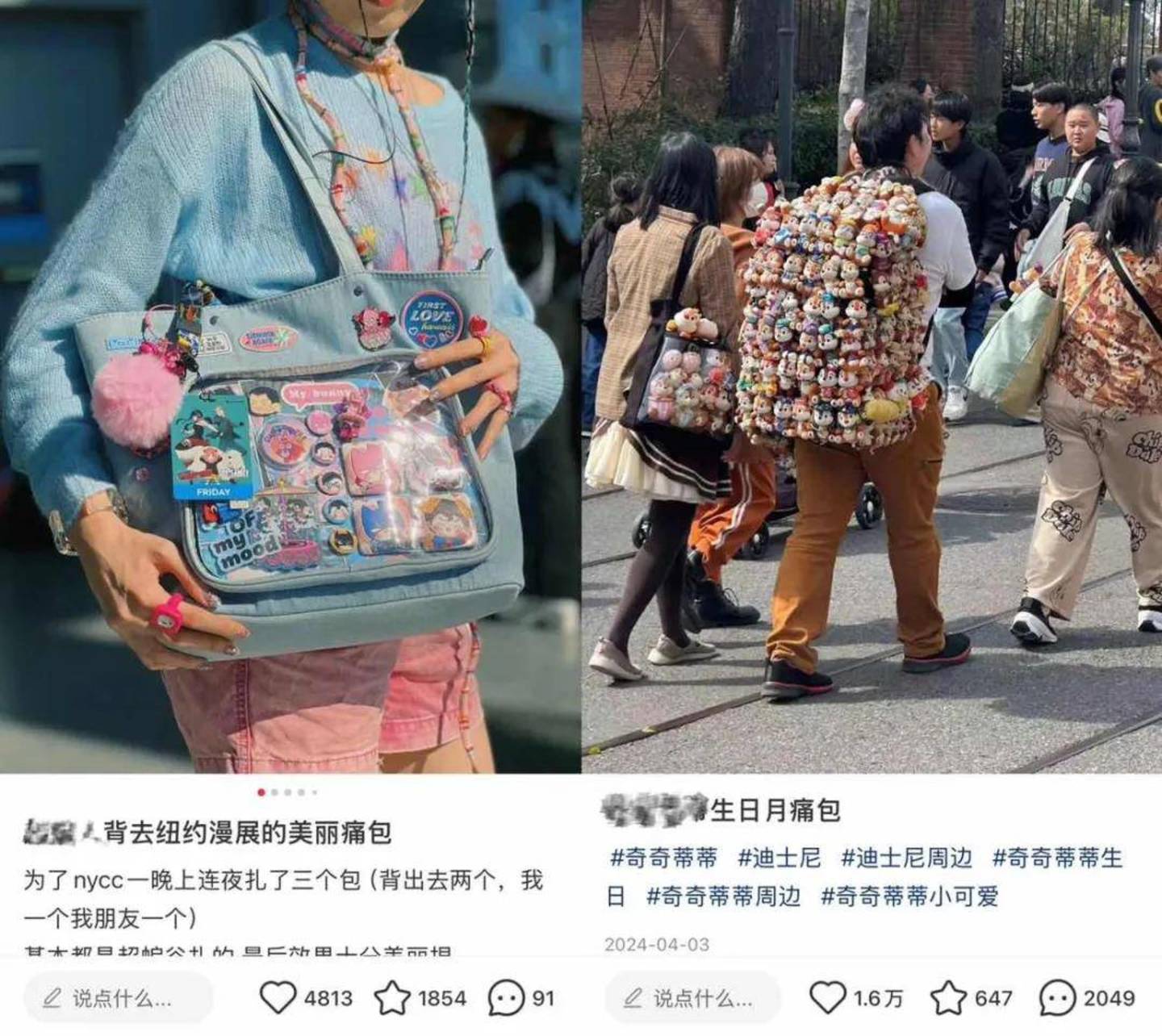 不仅湖滨88,上海迪士尼乐园也是痛包的又一根据地,一大批年轻人将迪士尼各个IP的公仔“扎”在痛层,在与玩偶互动时展示自己的“战利品”。