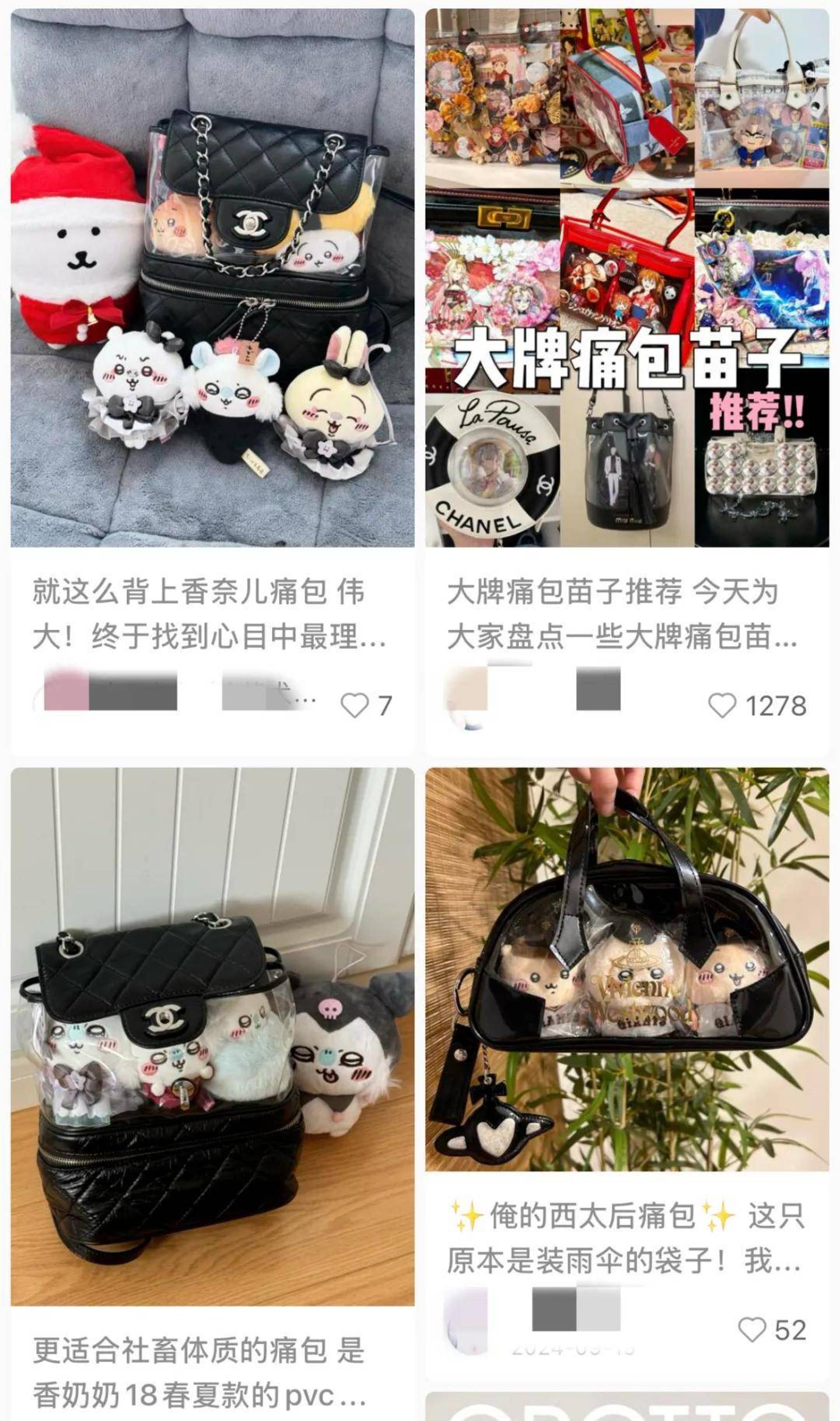 小红书上,有消费者晒出他们装满Chiikawa玩偶的“香奈儿18春夏款PVC双肩包”痛包,“中间的隔层正好可以带‘宝宝’出门,太适合‘痛’了。”除了香奈儿,还有LV的沙滩包,西太后的雨伞袋都被用户拿来“扎”成了痛包。