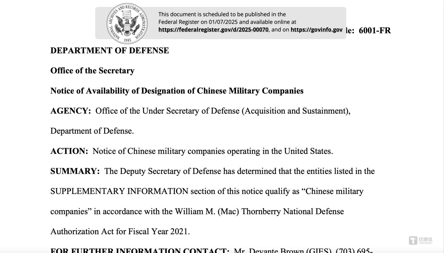 消息面上,当地时间1月6日,美国国防部通过《联邦公报》发布最新版的“中国涉军企业”清单(Communist Chinese military company,“CMC”,根据美国法律正式规定为“第1260H条名单”),将腾讯控股、宁德时代、长鑫存储、长江存储、华为控股、中芯国际、奇虎360公司、中国移动、中国联通、中国电信、华大基因等134家中国企业新增列入该清单。
