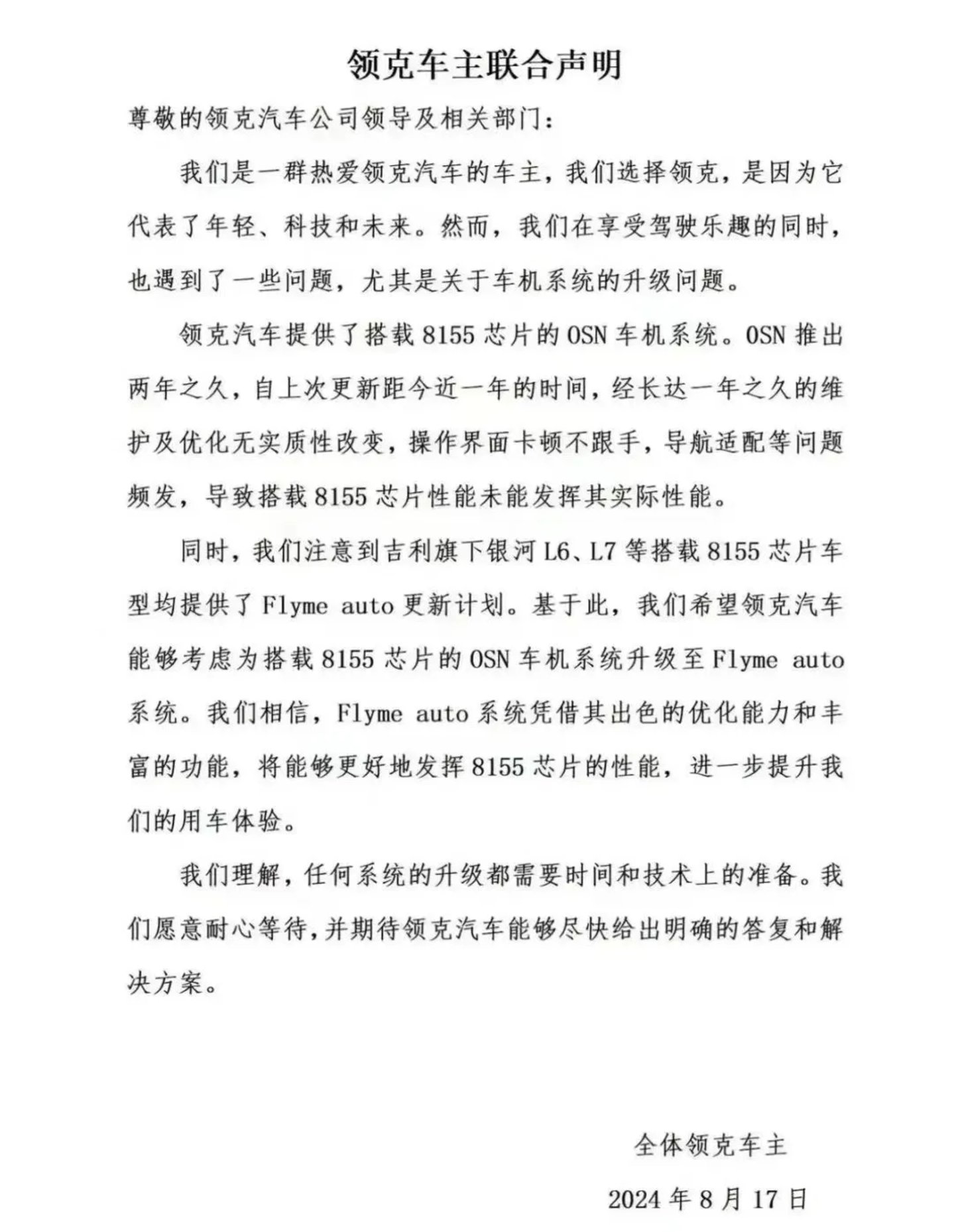 8月,200位领克车主发布《领克车主联合申明》,要求吉利为领克汽车更新芯片和flyme车机系统。
