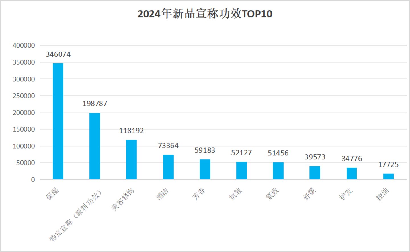 在产品功效宣称上,2024年注册备案的新品,主要集中于保湿、特定宣称(原料功效)、美容修饰、清洁、芳香、抗皱、紧致、舒缓、护发、控油等功效。