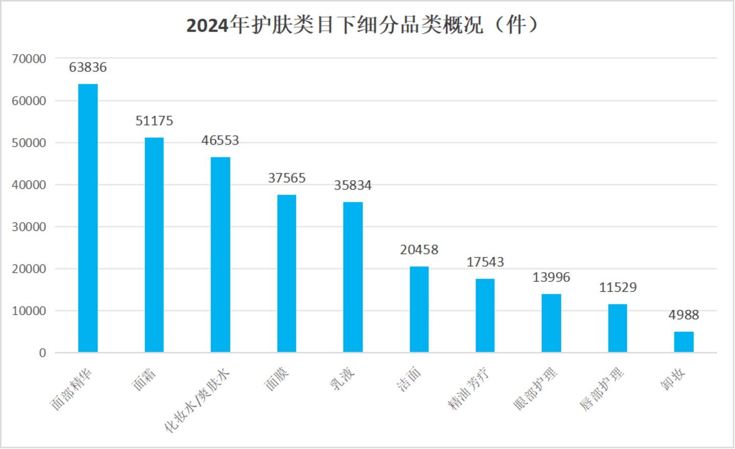 进一步来看,护肤品类中前五细分品类分别为面部精华、面霜、化妆水/爽肤水、面膜、乳液。其中,面部精华相关新品达63836 件,同比增长1.87%,也就是说,面部精华品类在化妆品市场上占据着核心地位。