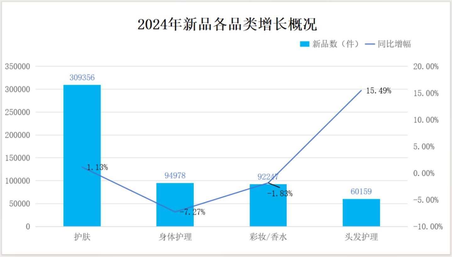 纵观整个2024年化妆品备案大盘,护肤品类占主导地位,新品数高达30万+,同比微增1.13%。