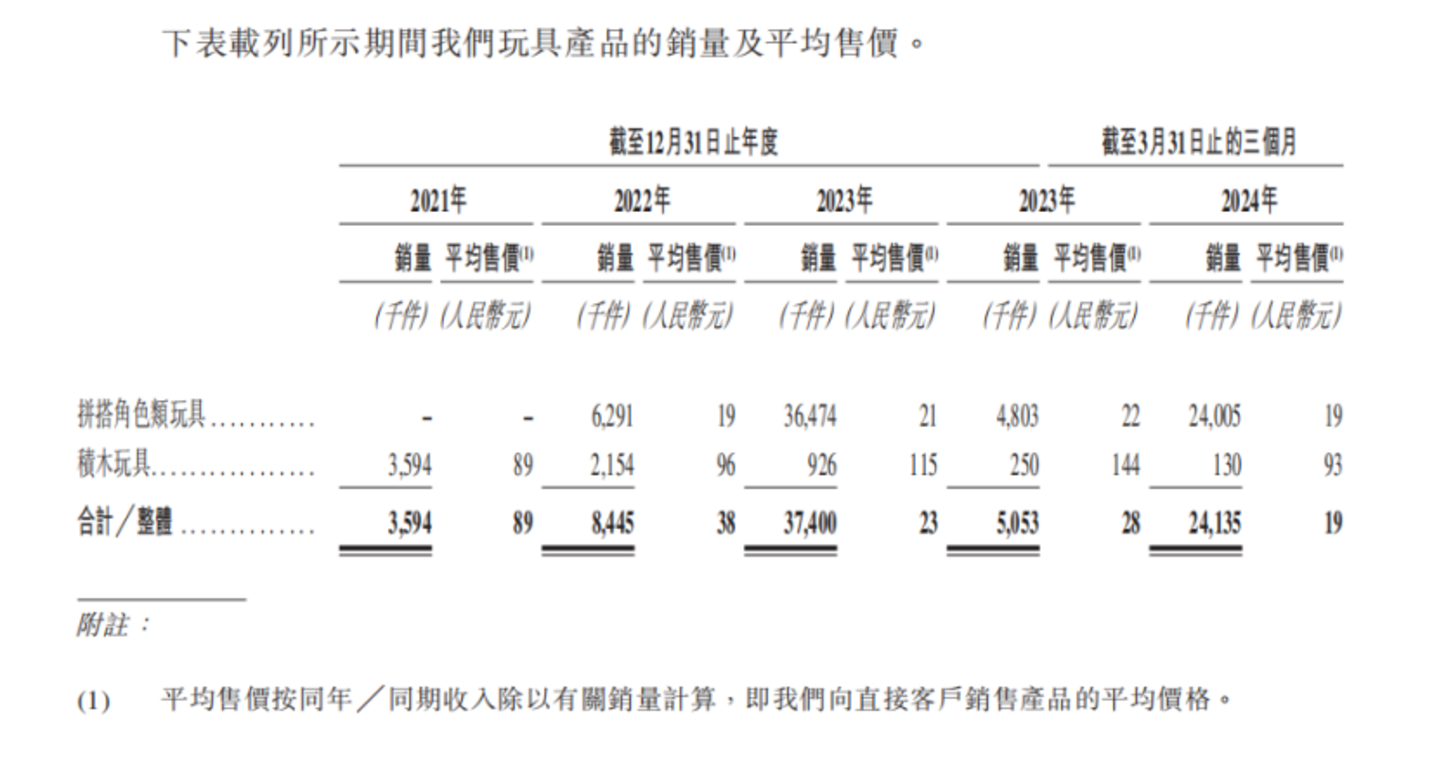 回顾2021-2023年以及2024年一季度,布鲁可玩具产品的销量走势堪称一条上扬的迅猛曲线。2021年,其销量为359.4万件;到了2022年,销量攀升至844.5万件;而2023年更是迎来爆发,销量如同井喷一般,高达3740.0万件;2024年一季度也毫不逊色,销量斩获2413.5万件的佳绩。