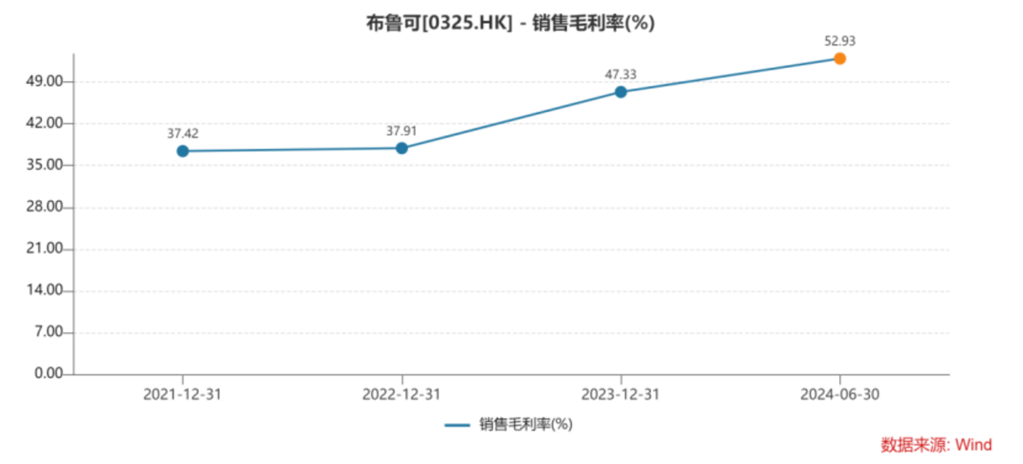 除了营收爆发,布鲁可的毛利率也并没有受到平均售价下降的冲击,反而逐年提高,由2021-2022年的不足40%,到2024年一季度已经超过50%。这意味着布鲁可不仅实现了营收的飞跃,还在产品端的盈利能力上,实现了质的蜕变。