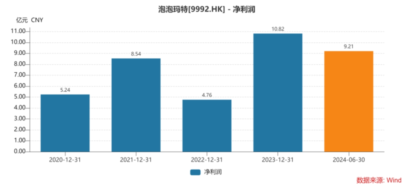 比如,在业绩上,泡泡玛特的净利润已经持续盈利多年,且增长势头强劲,2024年上半年的净利润,几乎已经接近2023年全年数据。反观布鲁可,依然难以扭亏。