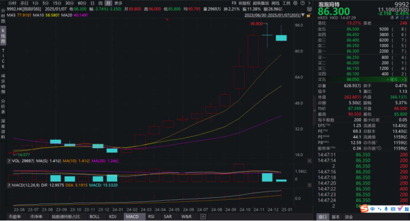 2024年,泡泡玛特的股价表现堪称惊艳绝伦,由年初的17.365港元,一路升至年末的96.9港元高位,涨幅最高超过450%。