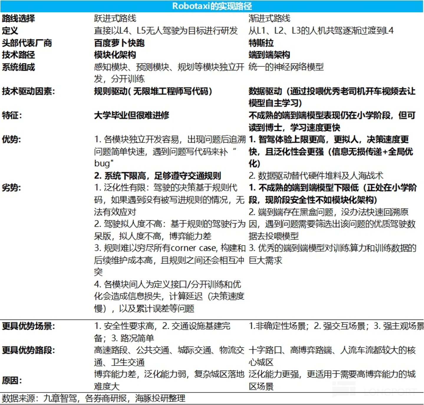 从目前布局Robotaxi的玩家来看,技术路径上分为模块化架构和端到端架构两种路线,领头羊分别是Waymo/萝卜快跑 vs特斯拉。