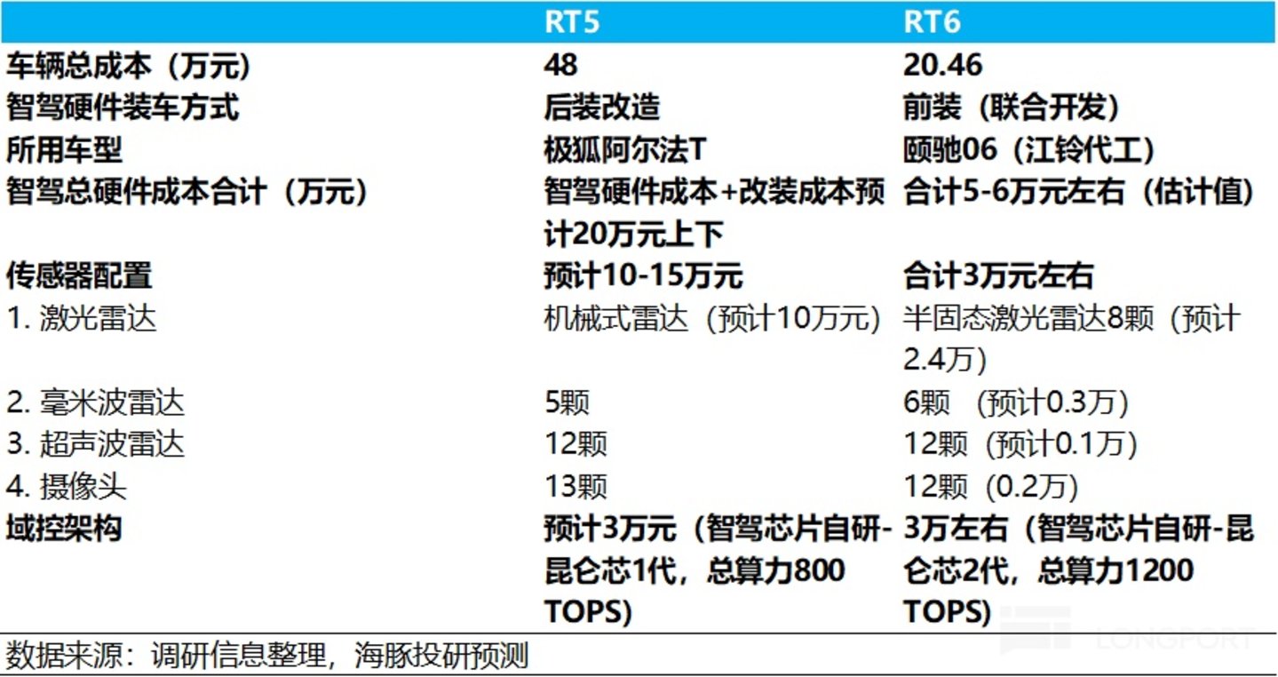 而百度已经推出了第六代萝卜快跑车型RT6,成本端已经从RT5的将近50万元,下降了约60%至RT6的20万元左右,主要通过前装量产方式和激光雷达供应链降本共同实现。