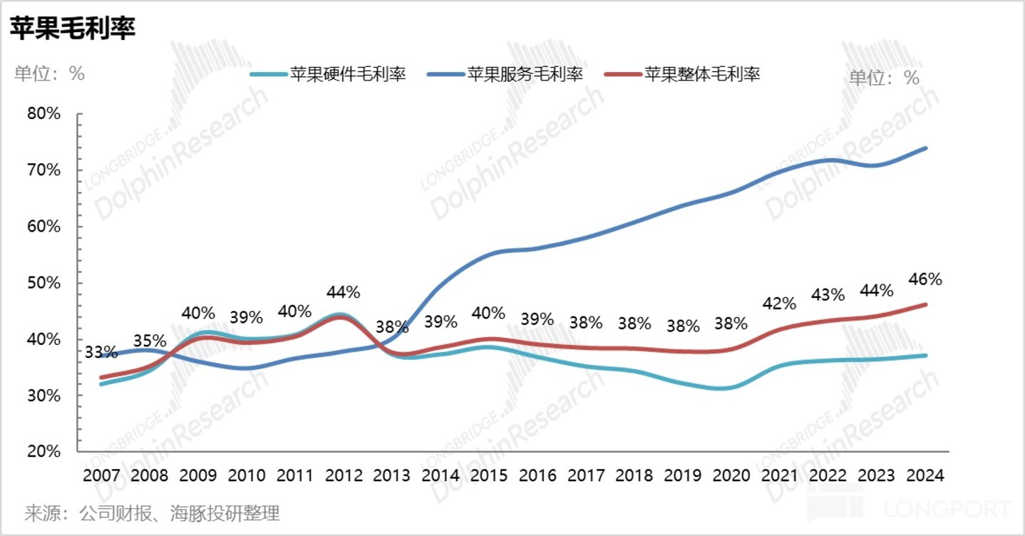 苹果服务业务高毛利将苹果整体毛利率2007年从33%拉升到2024年46%。