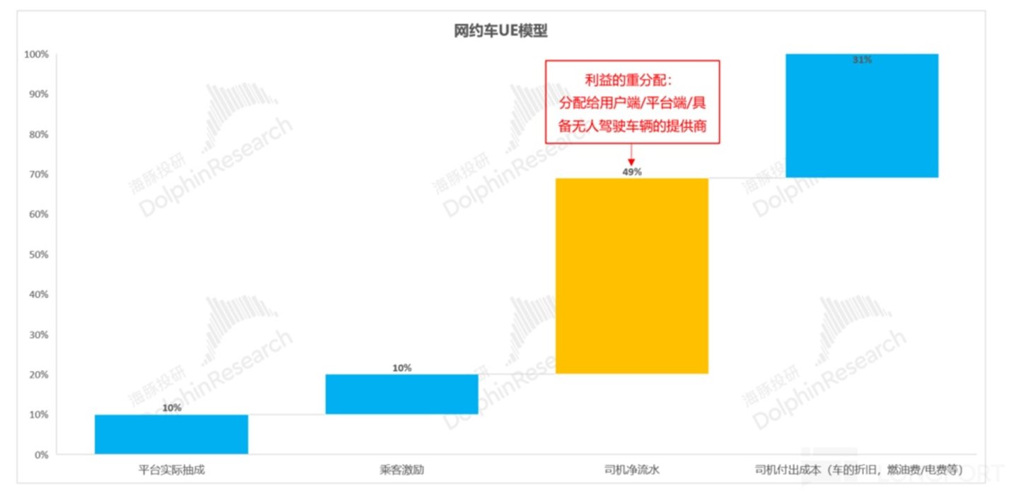 司机付出成本不变(车的折旧,燃油费/电费等),而之前有人驾驶车辆由于原先的用户的打车费用的接近一半都用于支付司机的人力成本,Robotaxi 能根本上改变的是将这节省下来的 49% 的部分进行利益的重分配(假设网约车都为新能源电动车,相比上篇文章UE模型做了调整)。