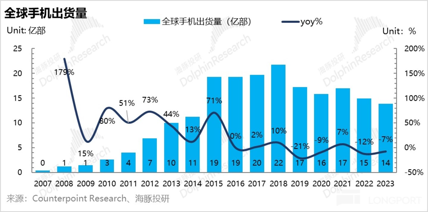 参考手机行业,继2007年后,苹果开始发布iPhone, 标志着智能手机时代的开始,全球手机出货量迅速增长。